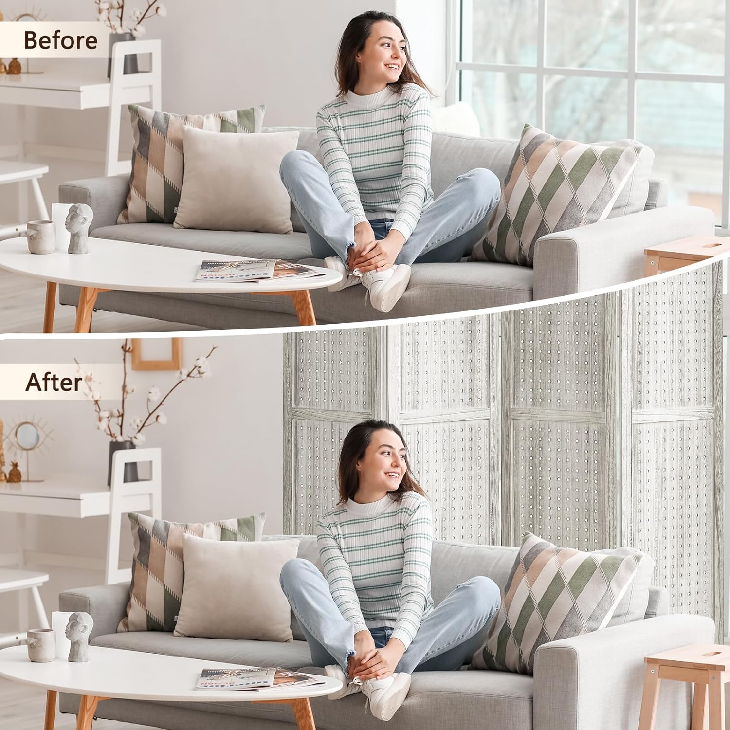 - Pure Solid Wood Construction - Pegboard display room divider is made of solid wood material, which is strictly screened and processed in multiple steps to ensure the quality and stability of each piece of wood. Room divider wood is finely sanded, with a smooth and delicate surface, warm to the touch, retaining the natural wood grain and colour, and showcasing the natural beauty of the wood