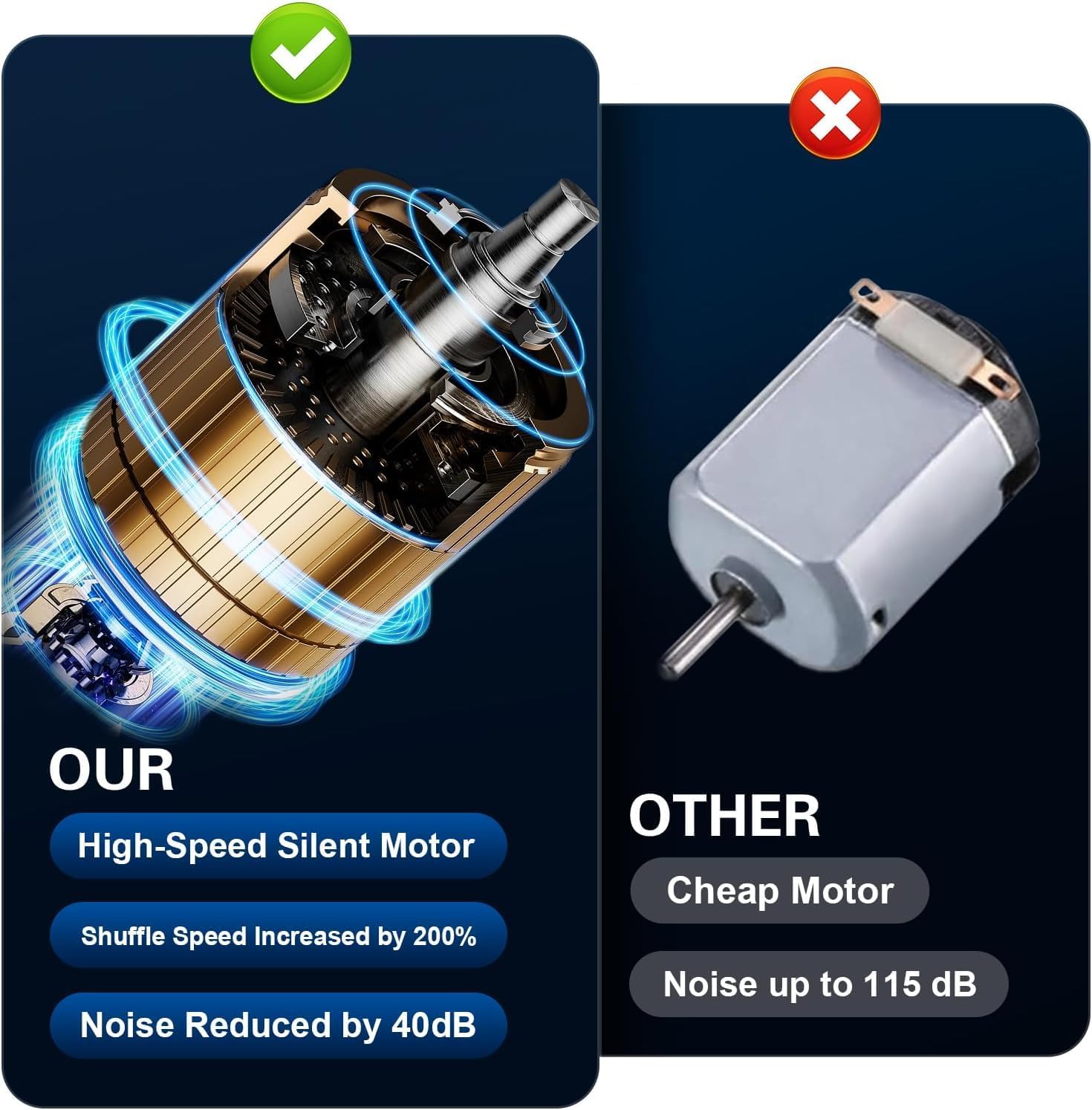 - 【High-Speed Low Noise Motor】 The card shuffler features a new high-efficiency low noise motor, operating at 10,000 RPM, With a powerful belt-driven system, it runs more stably and quietly, capable of shuffling 2 decks in just 2 seconds. This ensures less disruption and more enjoyment for card game enthusiasts!