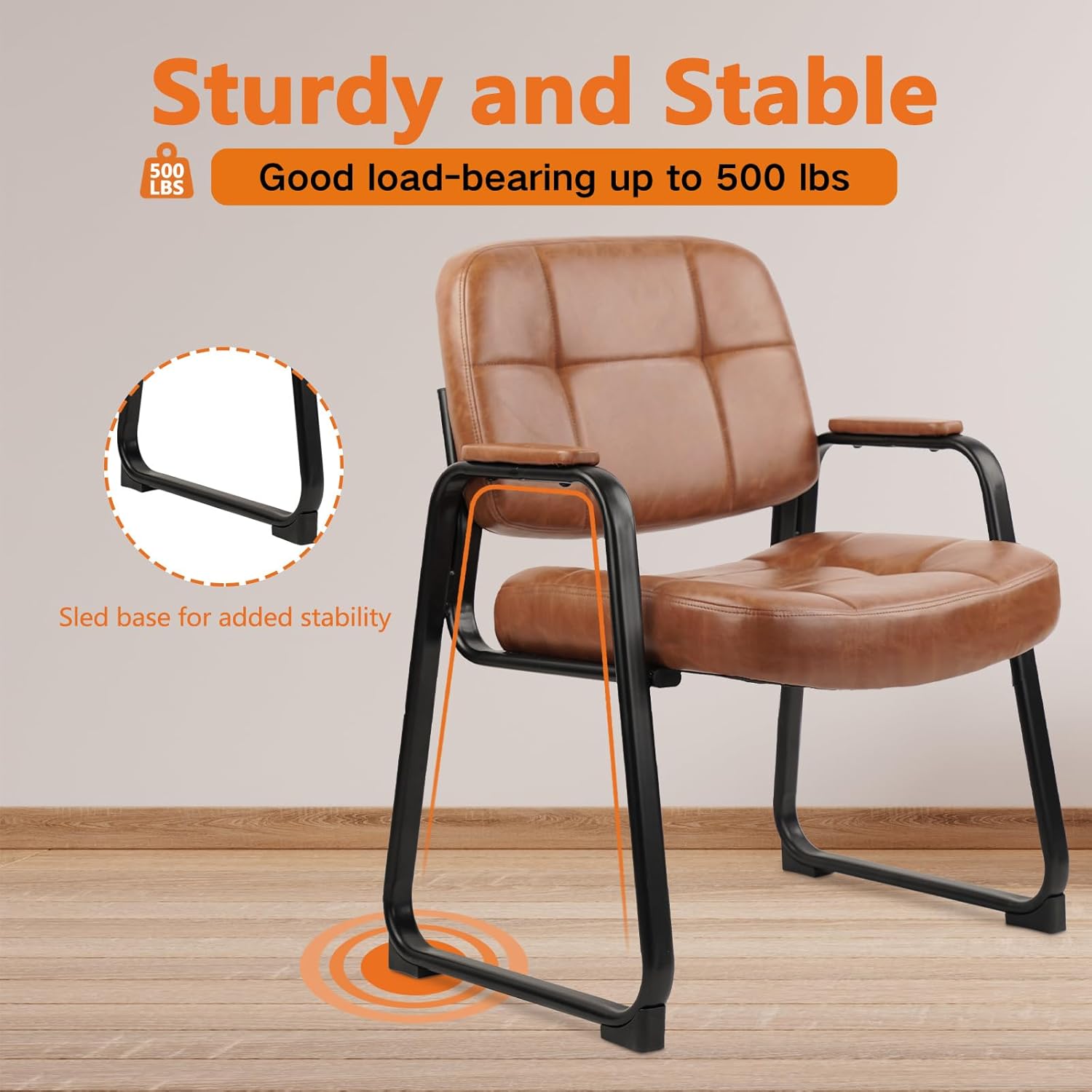 CLATINA Big & Tall 500 lbs Waiting Room Chairs with Padded Armrests and Sled Base, Leather Stationary No Wheels Office Guest Chair for Reception Lobby Home and Meeting Conference, Brown (2 Pack)