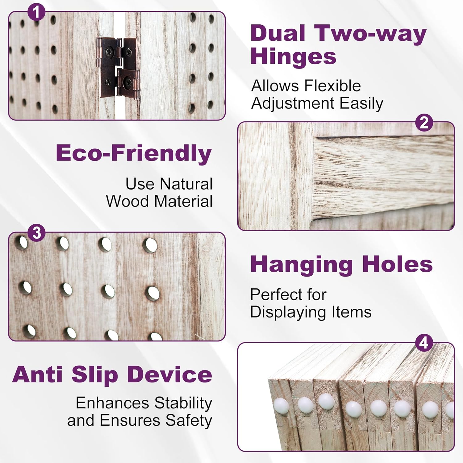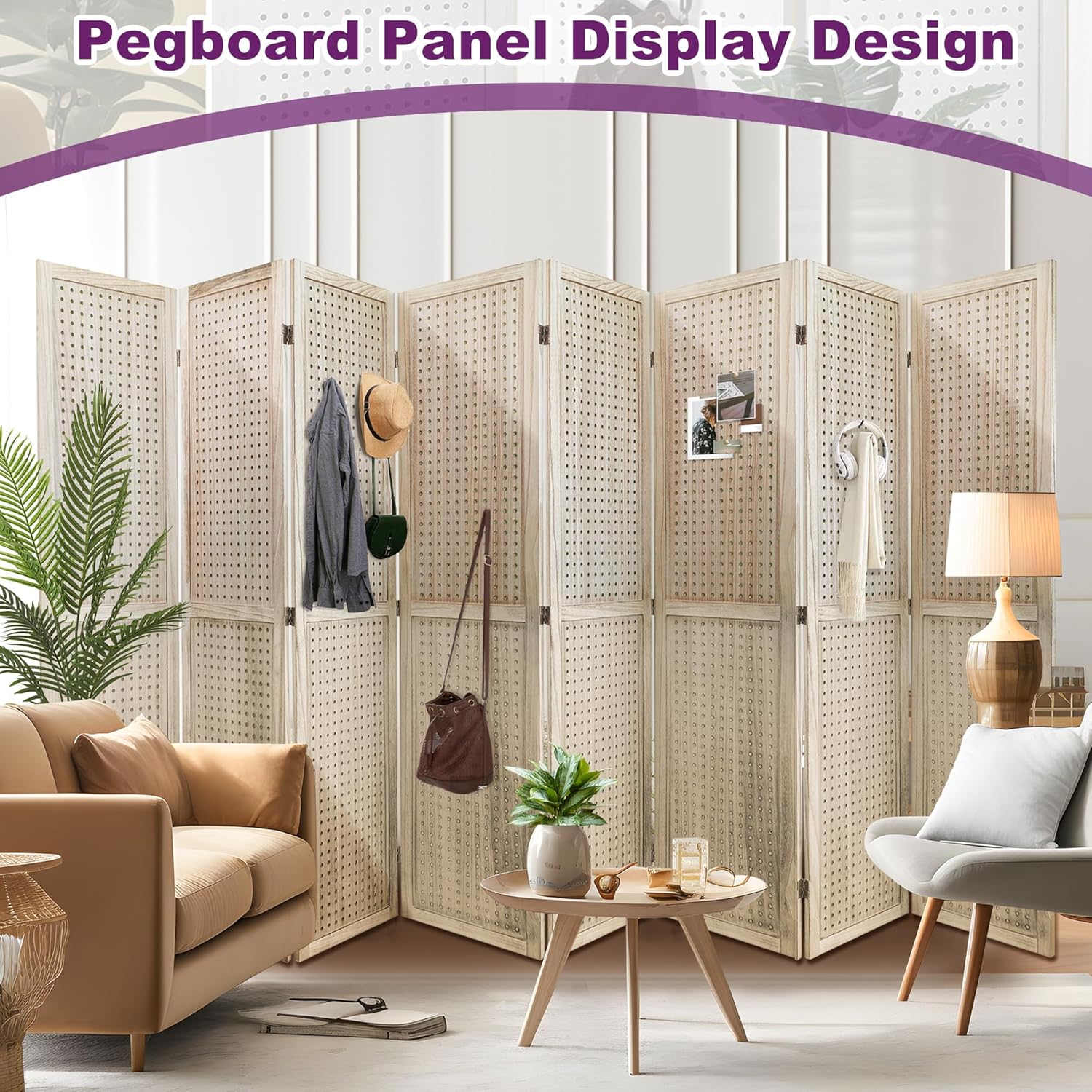 Room Divider, 5.6FT Folding Room Divider Panel, 8 Panel Pegboard Display Wood Partition Wall Divider for Room Separation& Craft Shows, Natural Wood