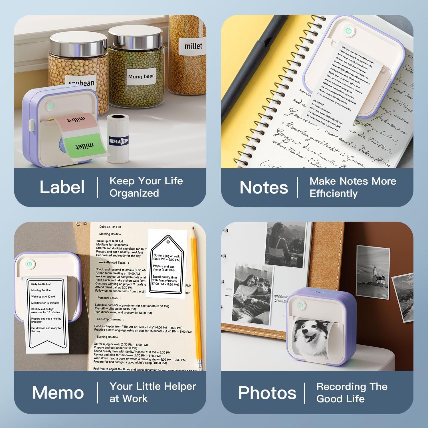 - 7 ROLLS DIFFERENT PAPER:Our D5 mini printer sticker maker includes 7 rolls of paper, making it more convenient to use than regular thermal paper. Come with (1 roll 40mm round +1 roll colorful 50*30mm) composite label printing paper, (4 roll white+1 roll green) adhesive stickers eliminate the need for tape or glue, providing a wonderful printing experience