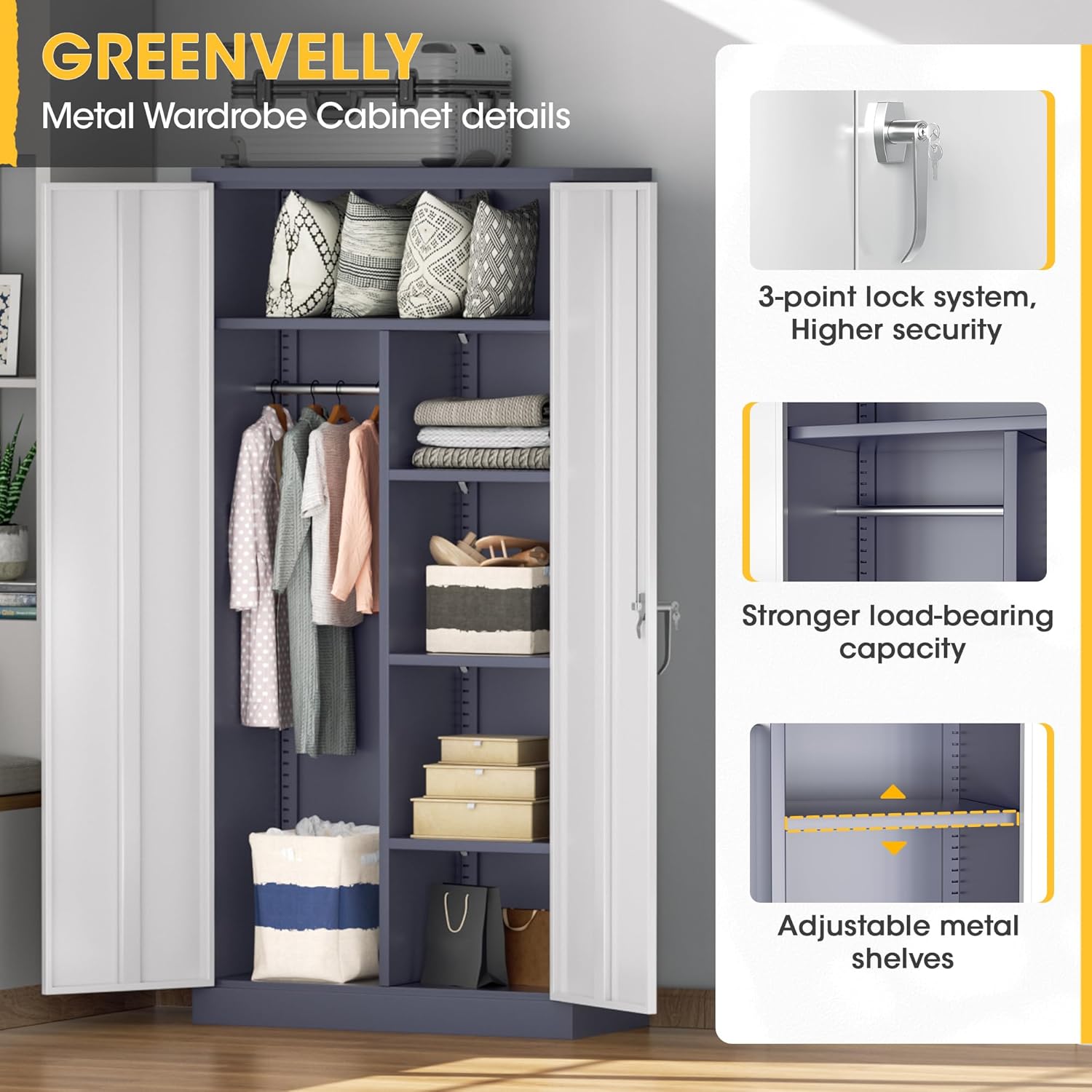 - SAFE AND STABLE: Greenvelly wardrobe cabinets are equipped with a 3-point lock with 2 keys to ensure the safe storage of valuables. In addition, its well-designed anti-tipping system enables the steel wardrobe to be securely fixed to the wall, effectively preventing the possibility of accidental tipping.Metal storage cabinet can be used with confidence, especially for families with children.
