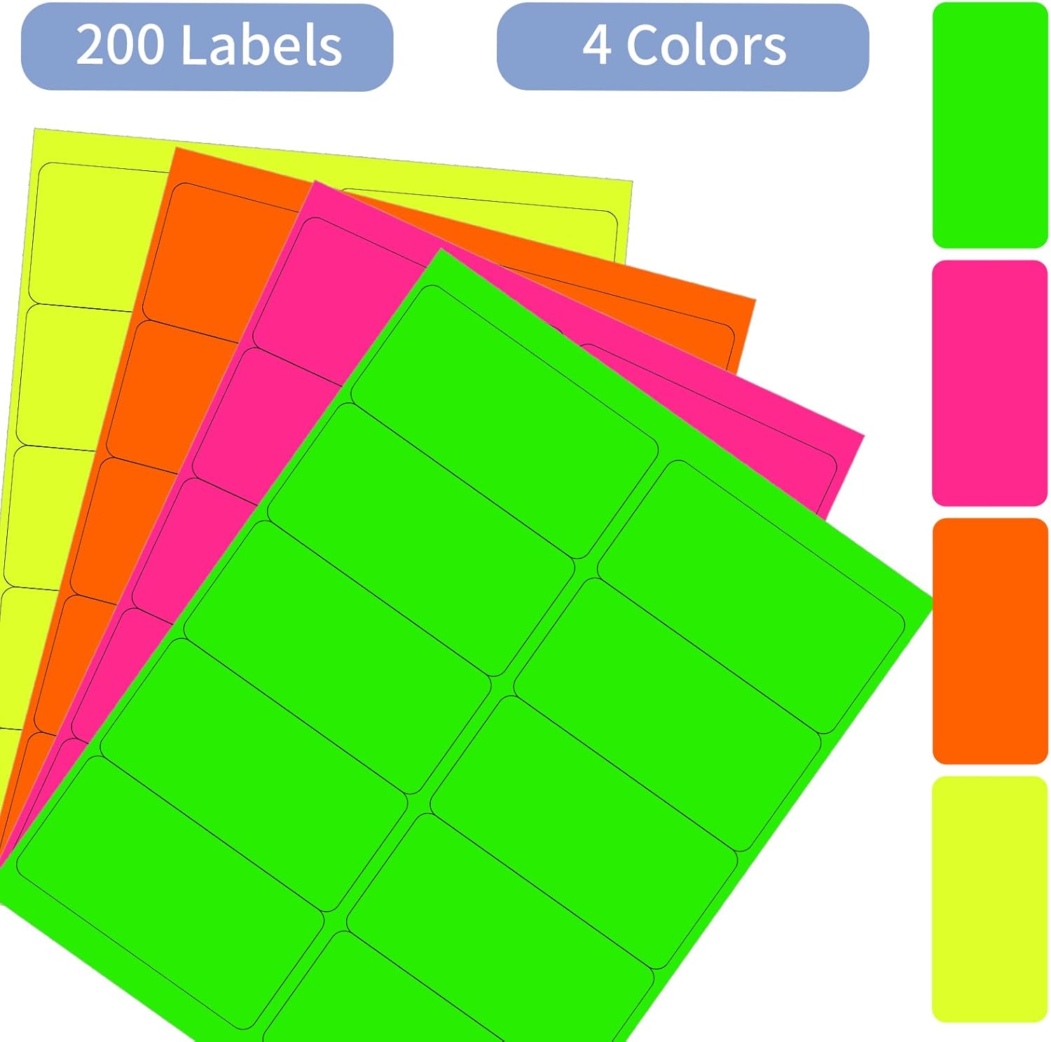 - PACKAGE: Labels sheets are standard size- 8.5" x 11", Label Size- 2" x 4", 30 Per Page/ 20 Sheets, Total 200 Labels, Fluorescent Orange, Fluorescent Green, Fluorescent Yellow, Fluorescent Pink