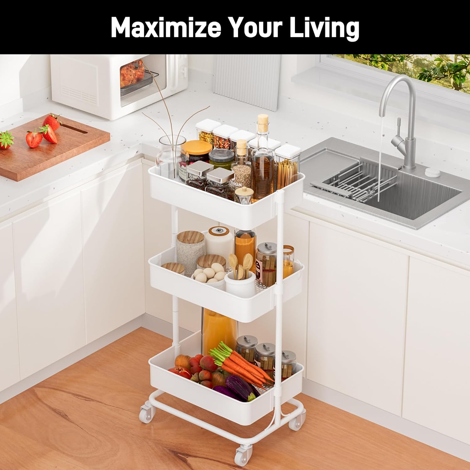 - 【Sturdy Metal for Maximum Stability】This rolling cart is crafted with sturdy metal to support up to 55 lbs. Three large and deep baskets provide enough space for your daily necessities, children's supplies, office supplies and more.