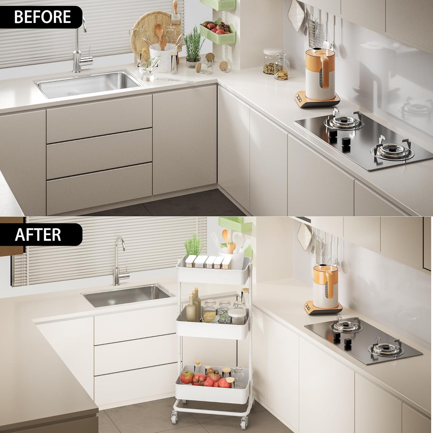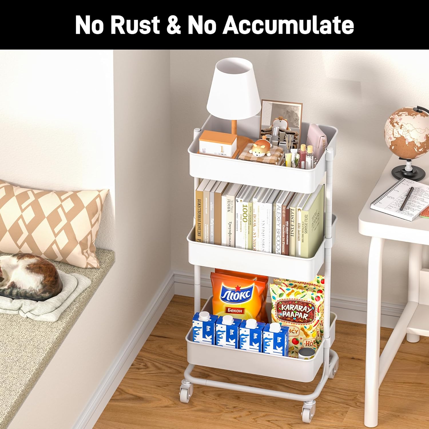 - 【Multifunctional Storage】The metal rolling cart with wheels can be used almost anywhere. It can be a snack cart, nursery cart, tool cart, service cart, book cart, or organization rack in your kitchen, bedroom, living room, office, garage, or workshop.