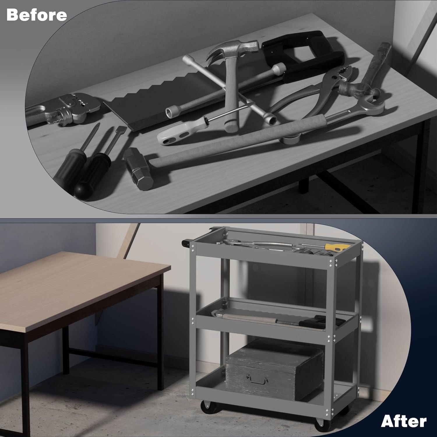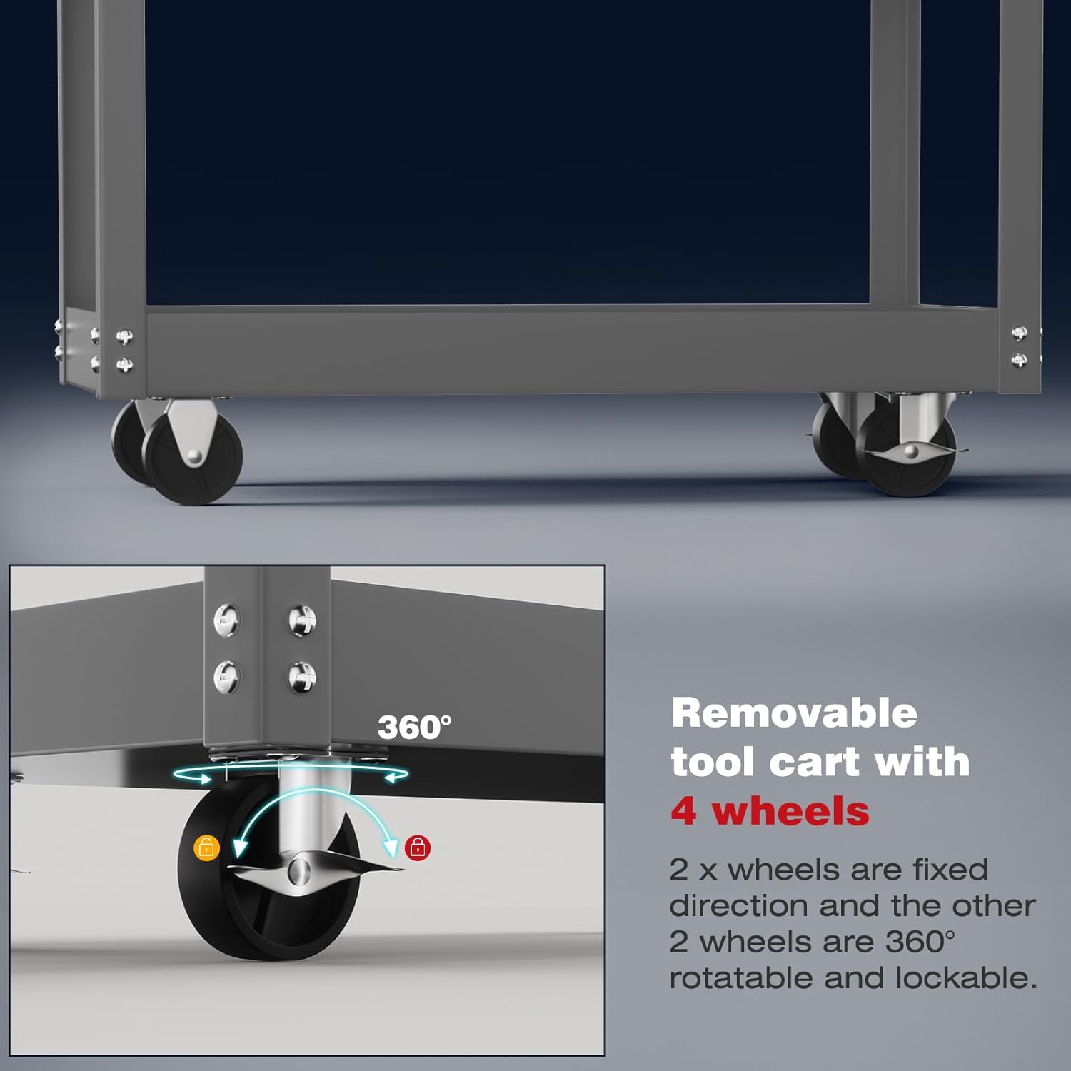 - [Easy to Move] The utility cart is equipped with four smoothly rolling wheels, providing excellent mobility and flexibility. Two locking casters can secure the cart in place when needed, keeping it stable. You can easily move tools within the workspace to enhance productivity