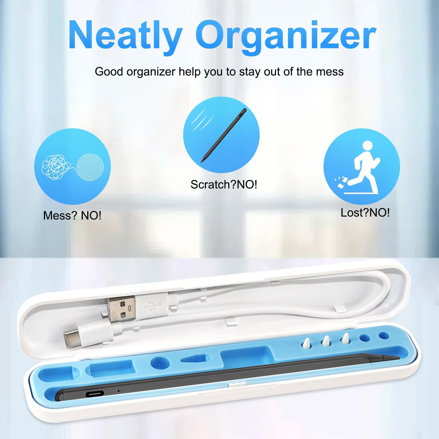 - Precision & Accuracy - This pen stylus is designed for pinpoint precision, making it ideal for detailed tasks like drawing, note-taking, and editing. The tip glides smoothly across the screen, allowing for effortless strokes and lines. Whether you're a student needing to take clear notes or an artist working on fine details, this stylus ensures accuracy, mimicking the feel of a real pen or pencil on paper for a natural writing experience. Unlike many styluses on the market, ours comes with a durable and stylish storage case, providing extra protection and making it easy to carry wherever you go.