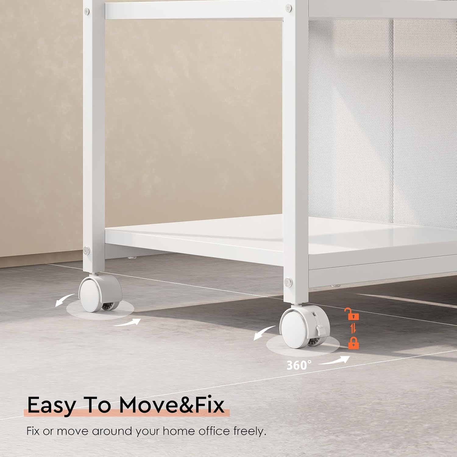 - [Easy Mobility] Mounted on four wheels, this printer stand can be moved and repositioned effortlessly. The two front casters feature built-in brakes, ensuring stability and preventing unwanted movement