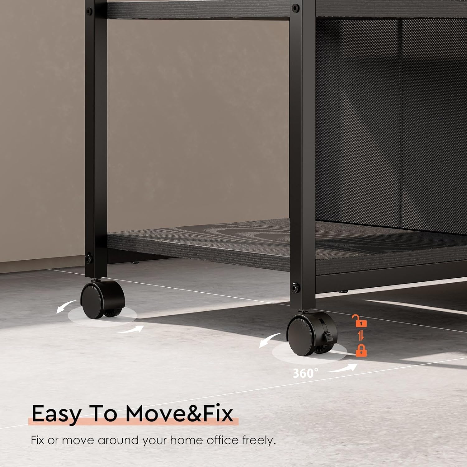 - [Easy Mobility] Mounted on four wheels, this printer stand can be moved and repositioned effortlessly. The two front casters feature built-in brakes, ensuring stability and preventing unwanted movement