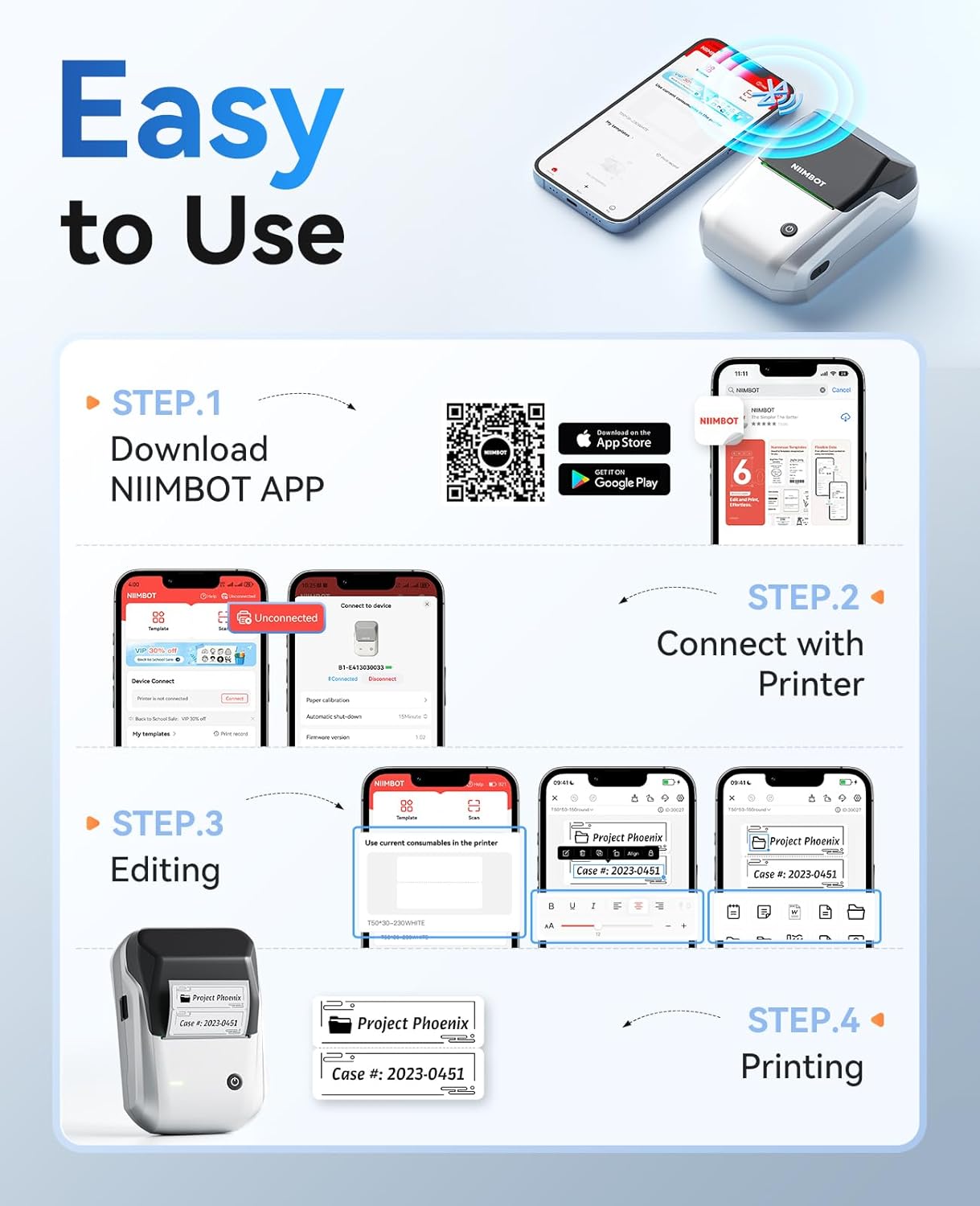 - 【Easy to Use】The B1 bluetooth label printer support iOS, Android. Download the "NIIMBOT"app, select the printer model B1 from the app, and connect printer. USB cable connection for PC, need to download driver form Niimbot brand official website, please see the details page video description.