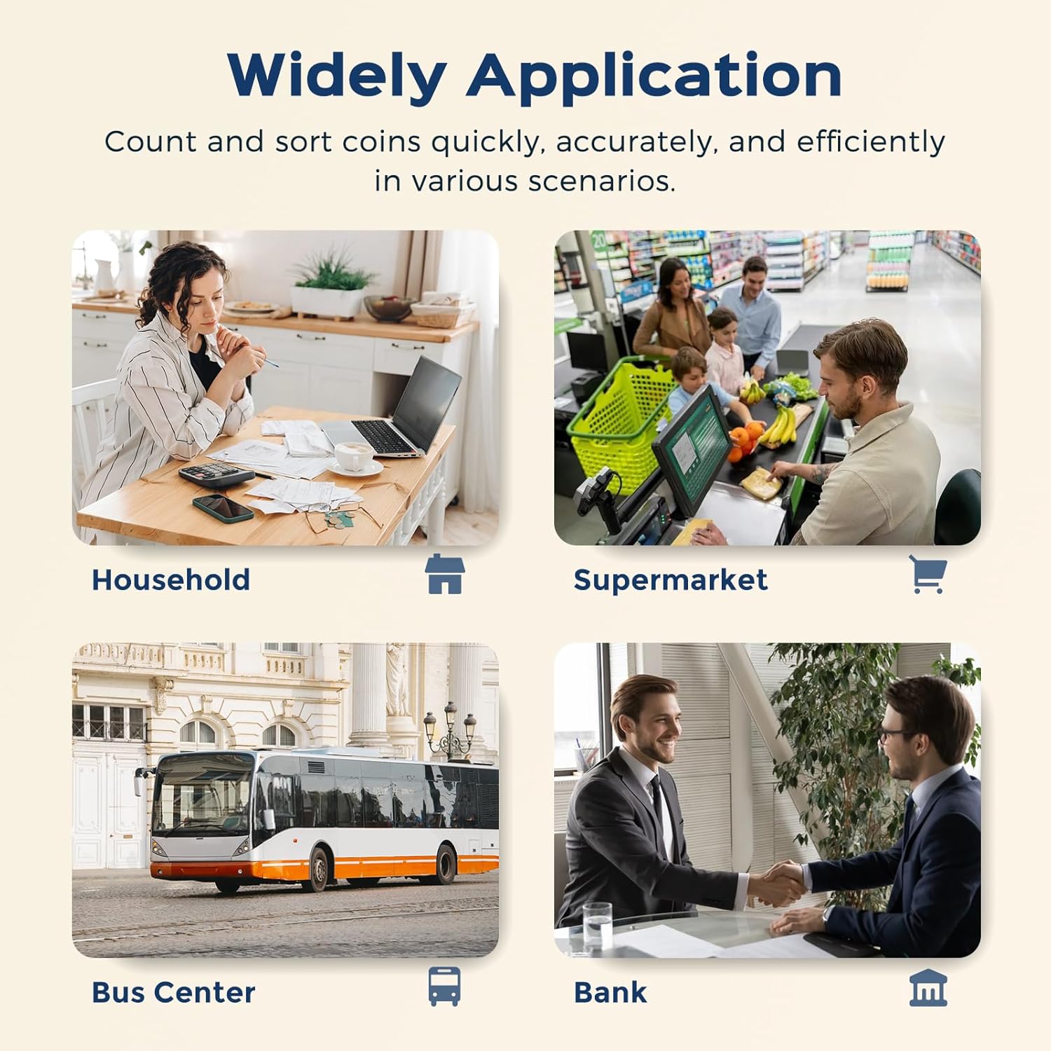 - Easy to use: Simply pour coins into the hopper and press the start button to automatically count and sort coins. The value and quantity of each coin can be easily viewed through the monitor, making the operation simple.