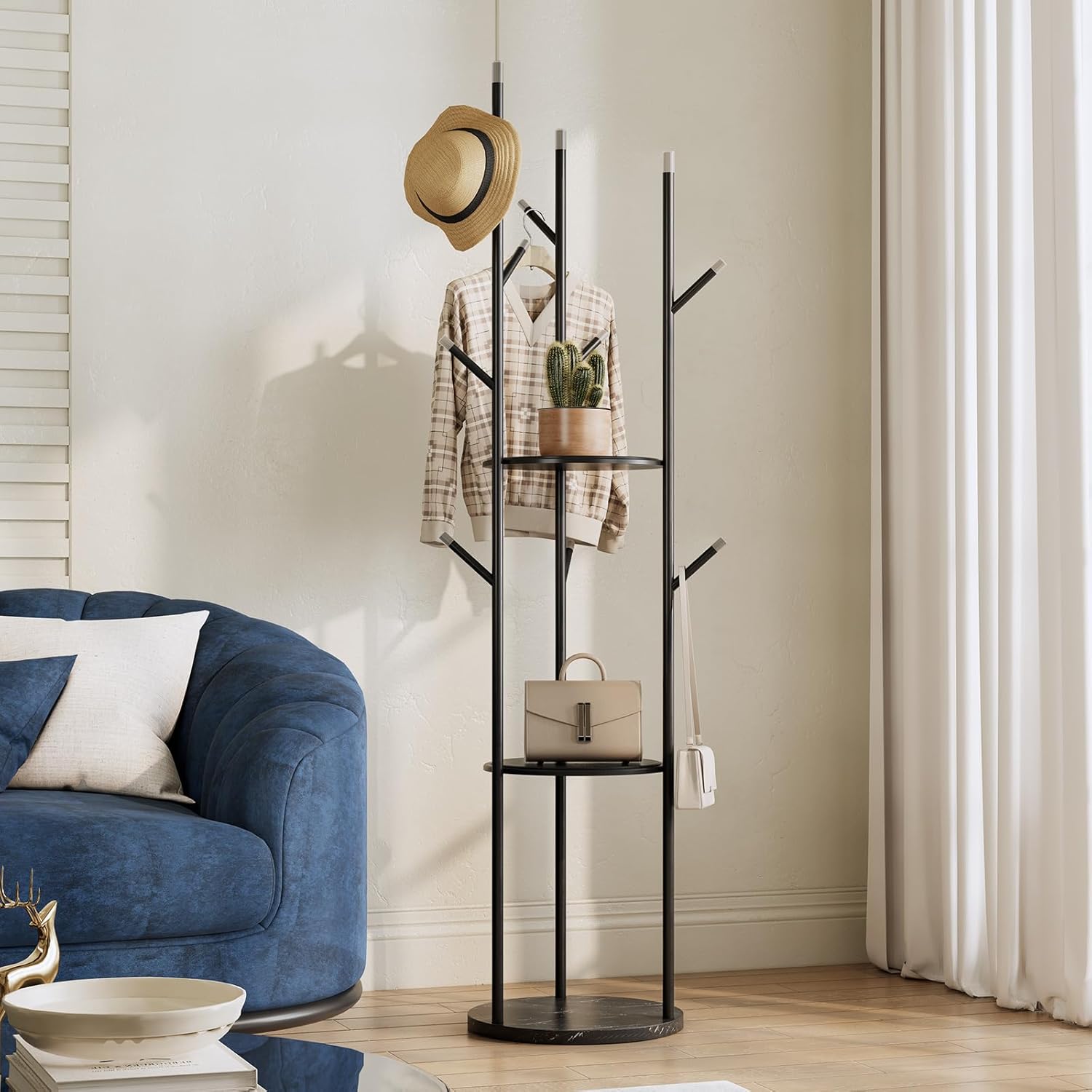 metal Coat Rack whit Marble base,heavy duty coat hanger Stand, Freestanding Coat Racks with 3 Shelves and 9 Hooks,Coat Tree for Entryway, Bedroom, Coats, Bags,purse