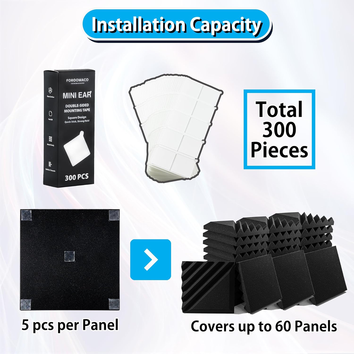 300 Pack Mini Ear Double-Sided Mounting Tape Square Heavy Duty Adhesive for Sound Proof Foam Panels, Wall Decor, Wall Art, Easy to Peel and No Residue
