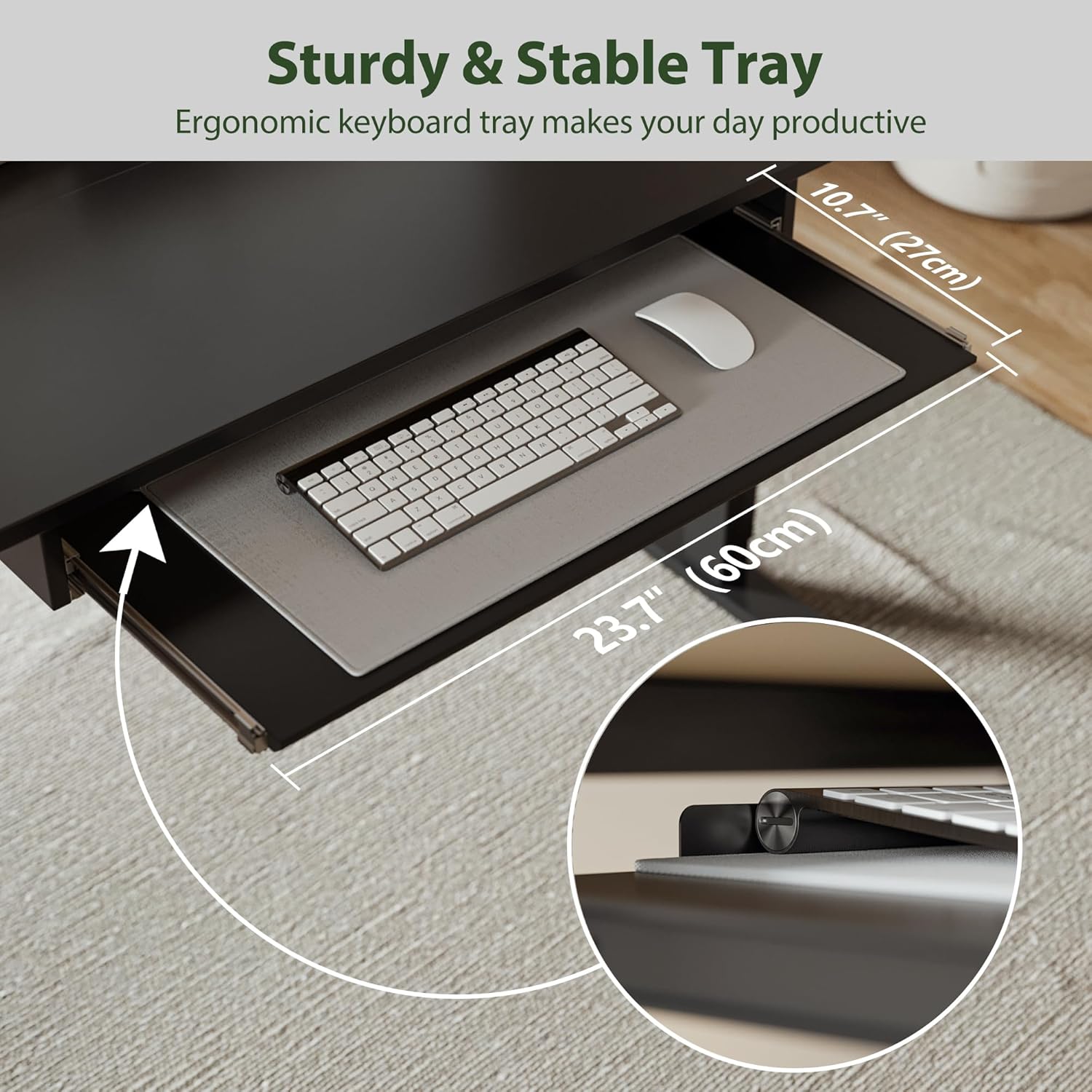 - 【Keyboard Tray & 2 Fabric Drawers】Keep your workspace organized with 2 fabric drawers above the desktop, perfect for storing essentials. The slide-out keyboard tray enhances ergonomic use of your keyboard and mouse. The tabletop is made from low-VOC materials, meeting both federal and state air quality standards.