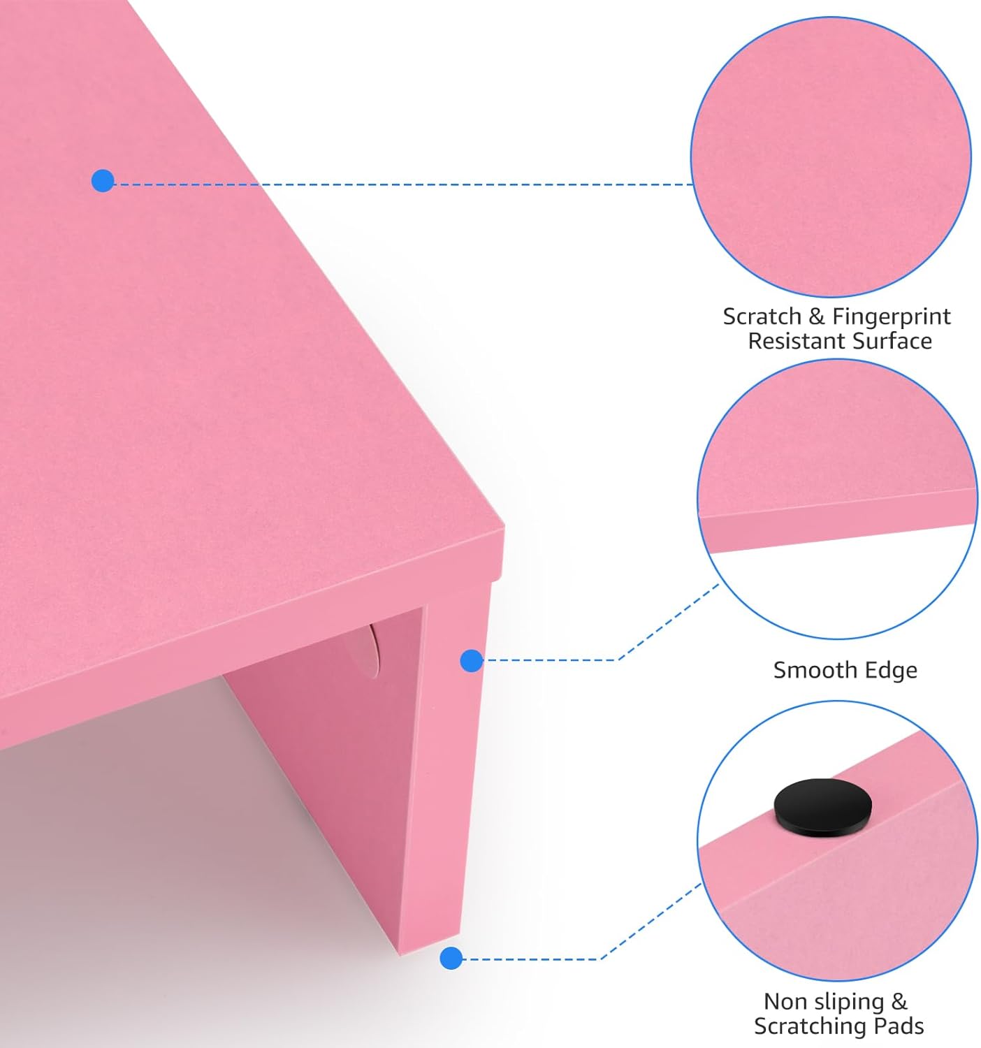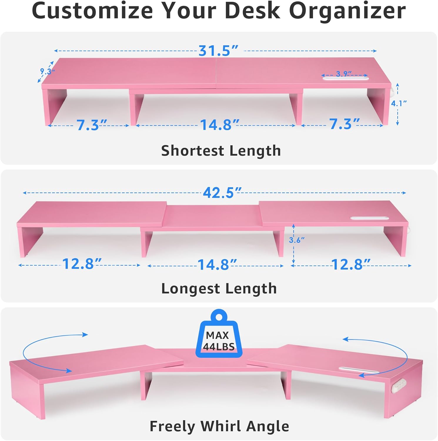 Dual Monitor Stand Riser for 2 Monitors, Monitor Stand for Desk, Adjustable Length & Swivel Angle Wooden Desktop Organizer Stand Riser with Smartphone Holder for PC Monitor Laptop, Pink
