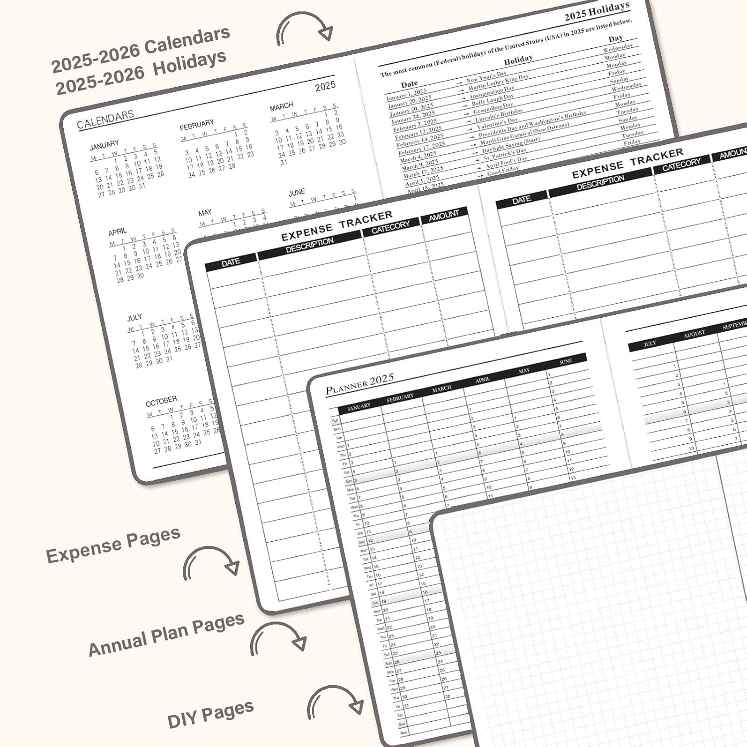 - EXTRA PAGES: This daily planner 2025-2026 also contains 2025-2026 Yearly Overview Page, 2025-2026 Holiday, Calendar Page, DIY Pages, Expense Tracker Pages, bookmark ribbons and binding band allow you to quickly browse and locate the current date