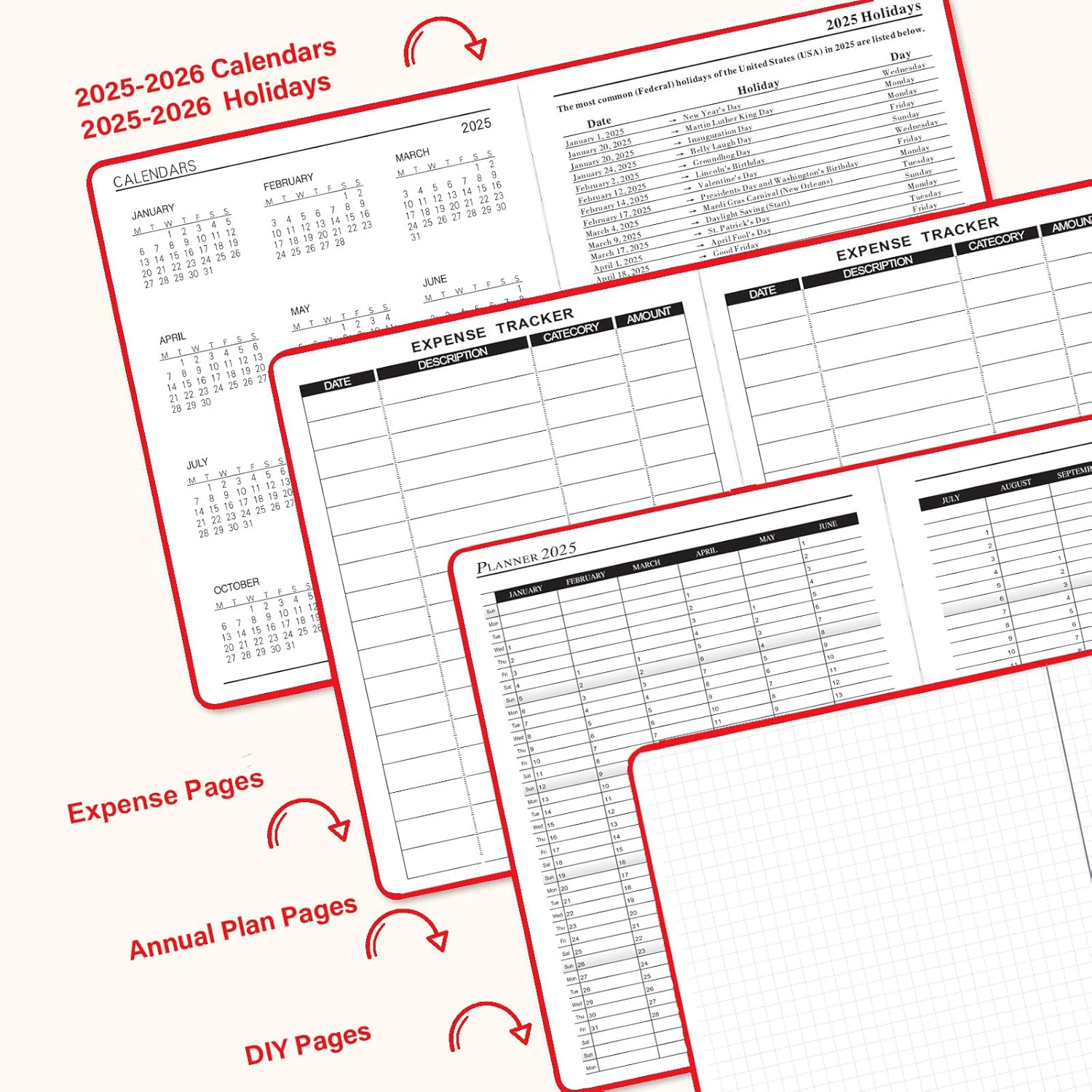 - EXTRA PAGES: This daily planner 2025-2026 also contains 2025-2026 Yearly Overview Page, 2025-2026 Holiday, Calendar Page, DIY Pages, Expense Tracker Pages, bookmark ribbons and binding band allow you to quickly browse and locate the current date