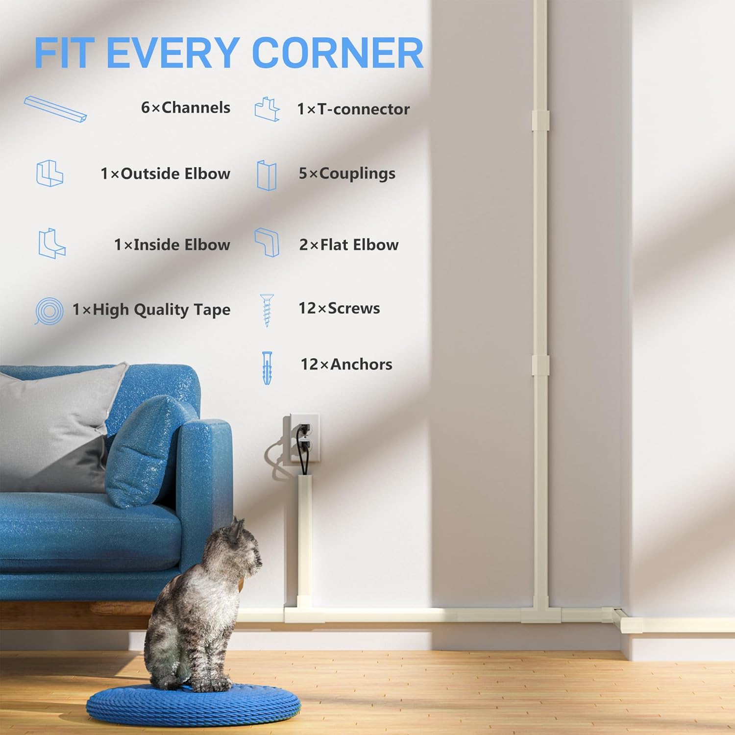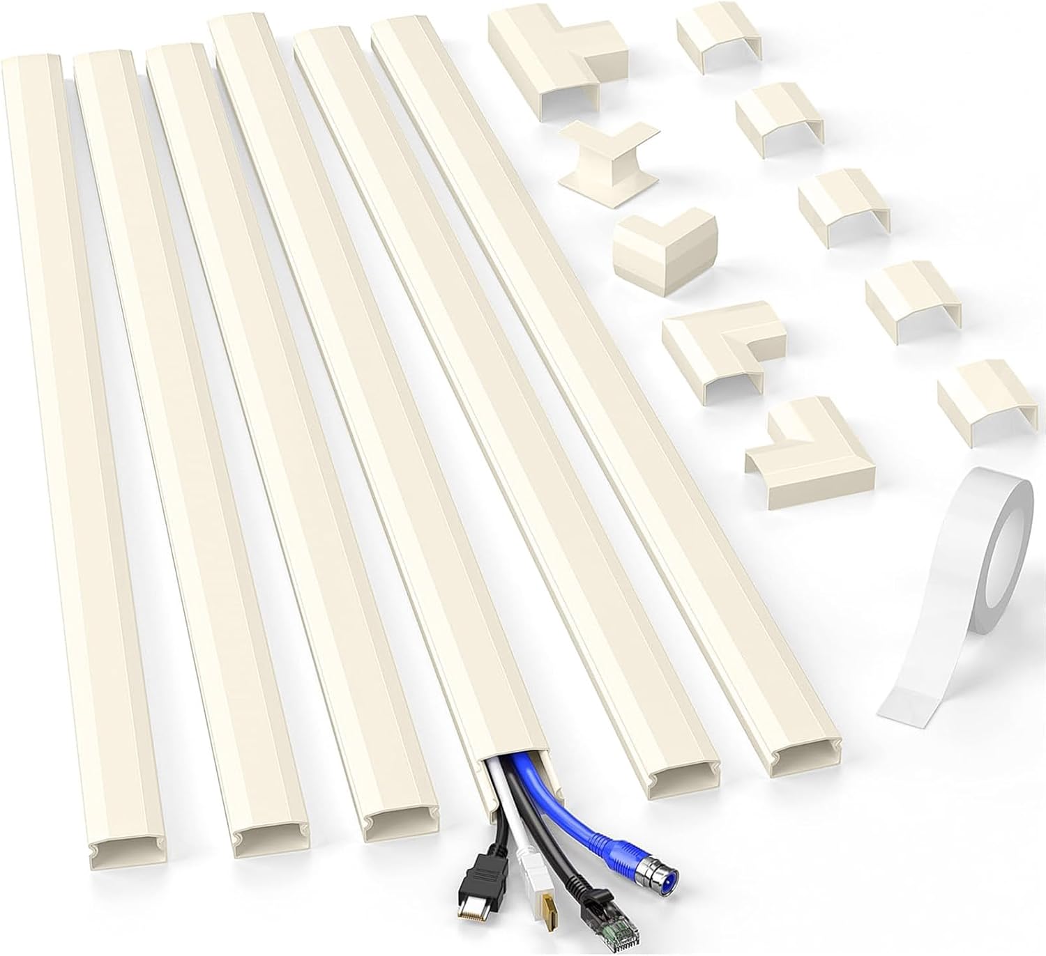 - Meets the Needs of Most Households Cable Management: The large-size beige cord hiders are ideal for hiding 3-4 TV/Audio/Network cables, such as HDMI cables, Cat6 Ethernet cables, optical cables, and USB cables. The Delamu snap-on design beige cord covers wall kit has 6 cable hiders, 15.7 inches long each. The wall cord hider is 94.5 inches long in total. There are 10 different connectors (to fit each corner), 12 screws and 12 anchors, and 1 adhesive tape
