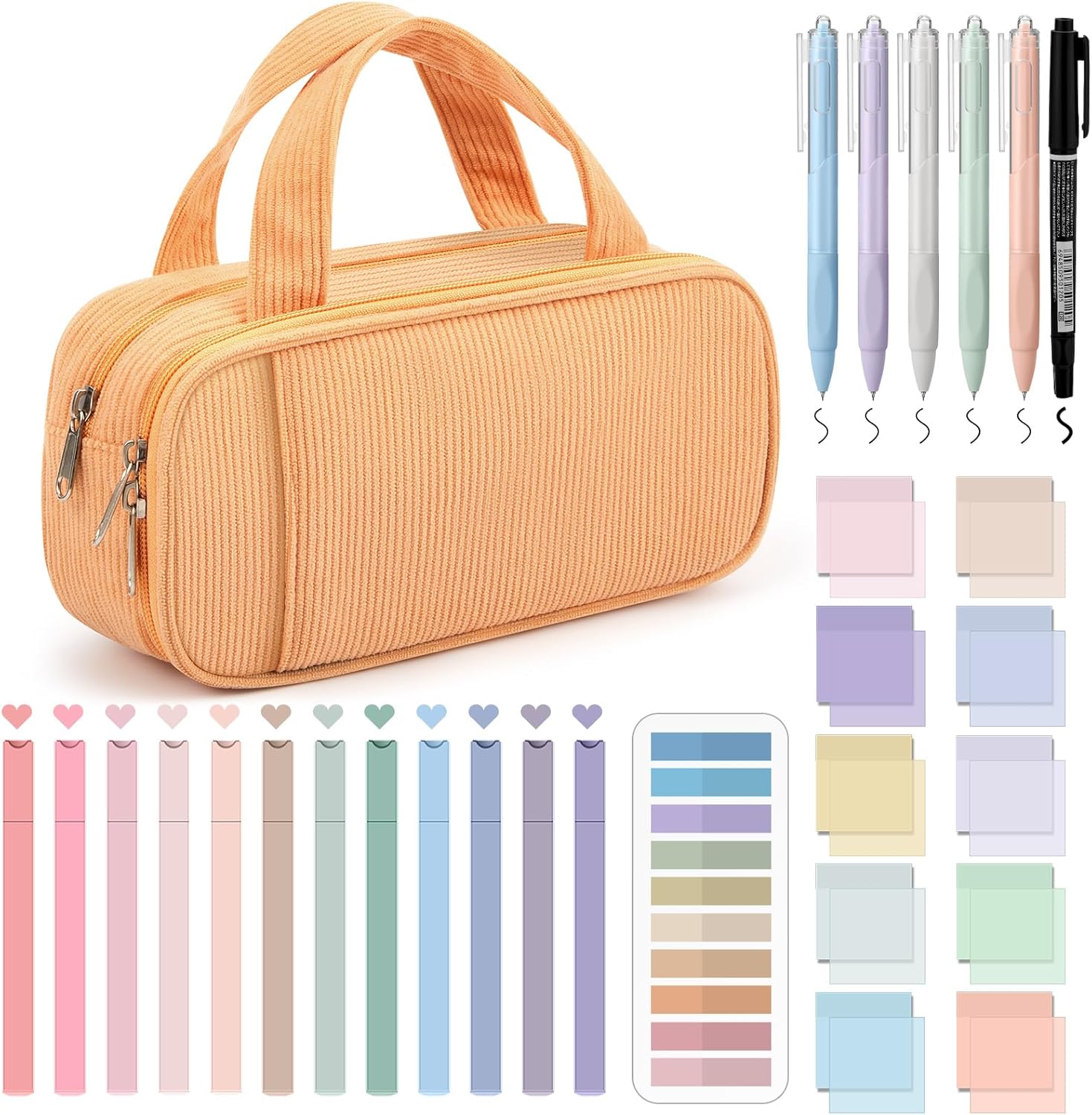 - Daily Use: aesthetic school supplies are suitable for everyday use, including 12 highlighters, 5 ballpoint pens, diverse colors, 1 orange pen case, 1 marker pen, 10 pads of square sticky notes (500 sheets), 1 pad of sticky index tabs (200 sheets), gratifying your daily use and replacement demands for journal, notepad, work, study notes, bible study available for family, office, travel and so on