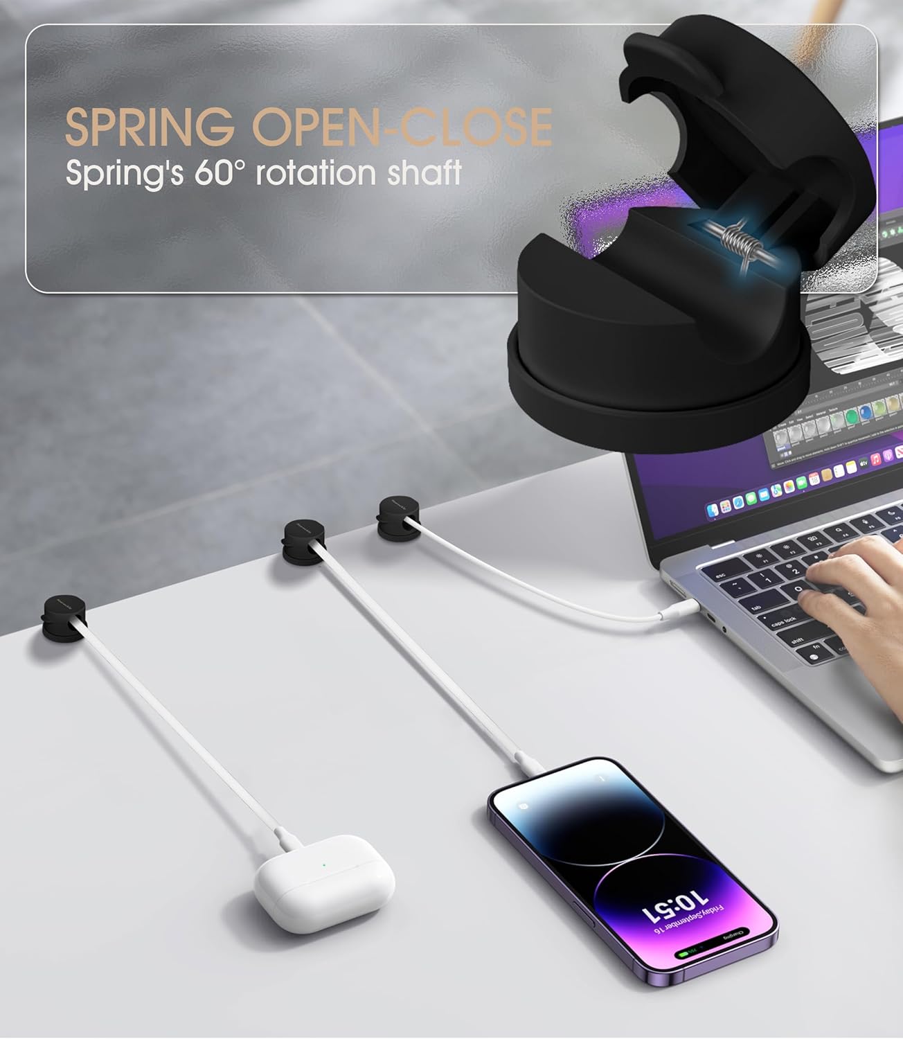 - 【Spring Design -1s Quick Lock Wire】Our cable clips adopt a spring opening and closing design, allowing you to quickly and safely place and remove mobile phone charging cables, HDMI cables, and household wires with just one hand