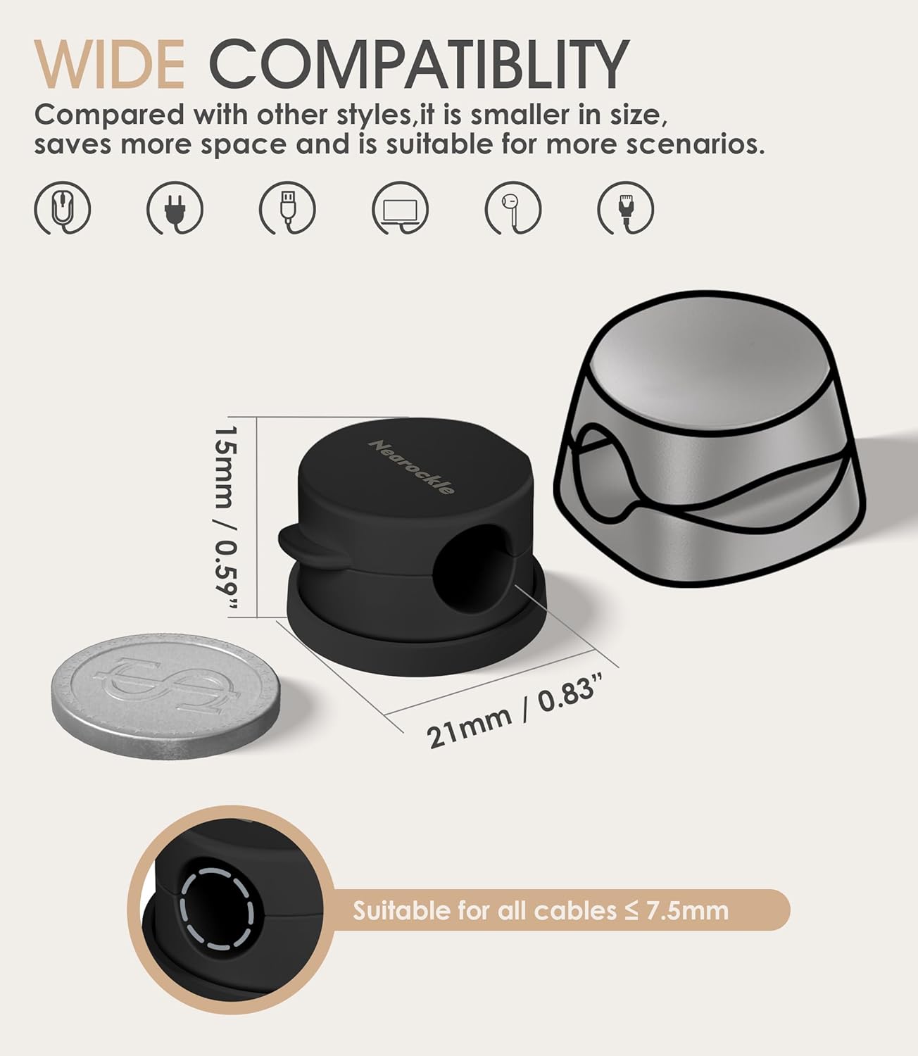 - 【7.5 mm Perfect Cable Slot Diameter】The 0.3inch (7.5mm) diameter can hold most cables, such as mobile phone charging cables, USB cables, HDMI thick cables, computer power cables, etc. Moreover, it can ensure that the charging cable as small as the iPhone original charging cable is fixed and does not fall off, pulled out smoothly