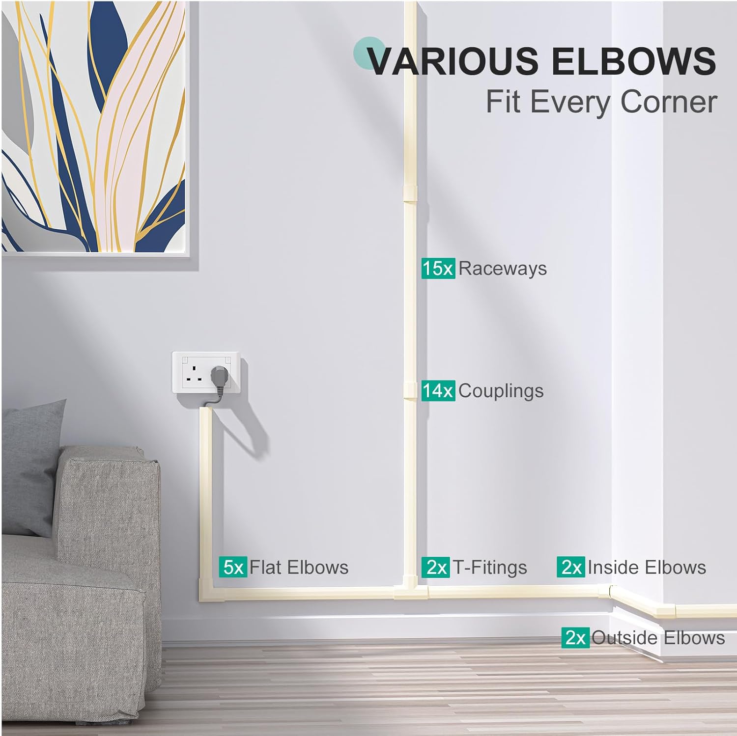 - 15 Pcs Beige Cord Hider Kit: Our tTV cable hider includes 15×plastic cable cover raceways channels (each channel is L16.9in×W1.18in×H0.6in, 254 inches total in length), 14×Couplings, 5×Flat Elbows, 2×T-connectors, 2× Inside Elbows, 2× Outside Elbows, 32×screws, 32×wall anchors, 2×rolls of double-sided tape and an installation guide, 254" beige cord covers for cords on wall enough for just about any job