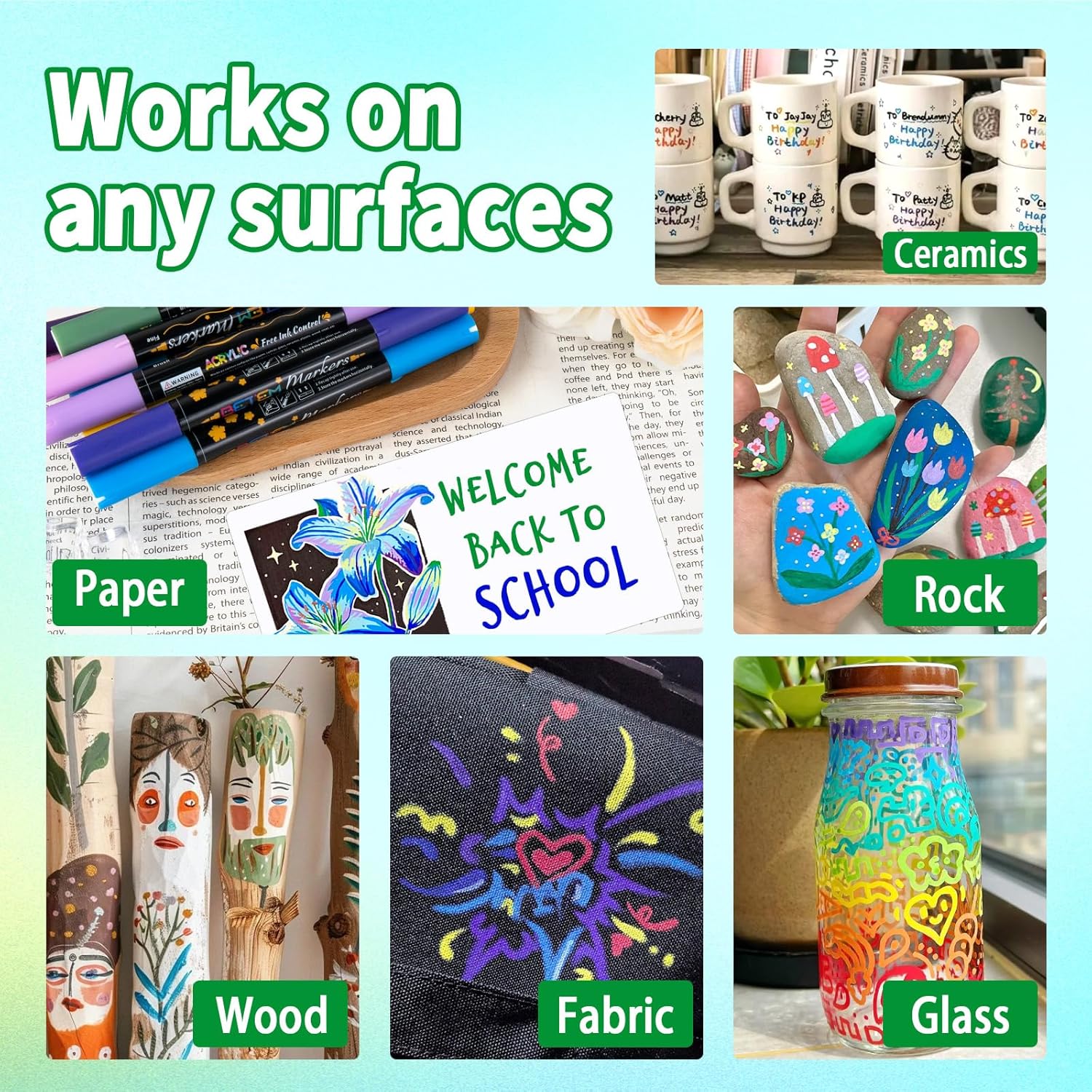- 【Work Well on Diverse Surface】The waterproof acrylic paint markers can widely used on a variety of surfaces such as rock painting, fabric, wood, stone, glass, ceramics, metal, plastic, canvas, eggs, Halloween pumpkins, greeting cards, and more. Keep your artwork colors alive for a long time