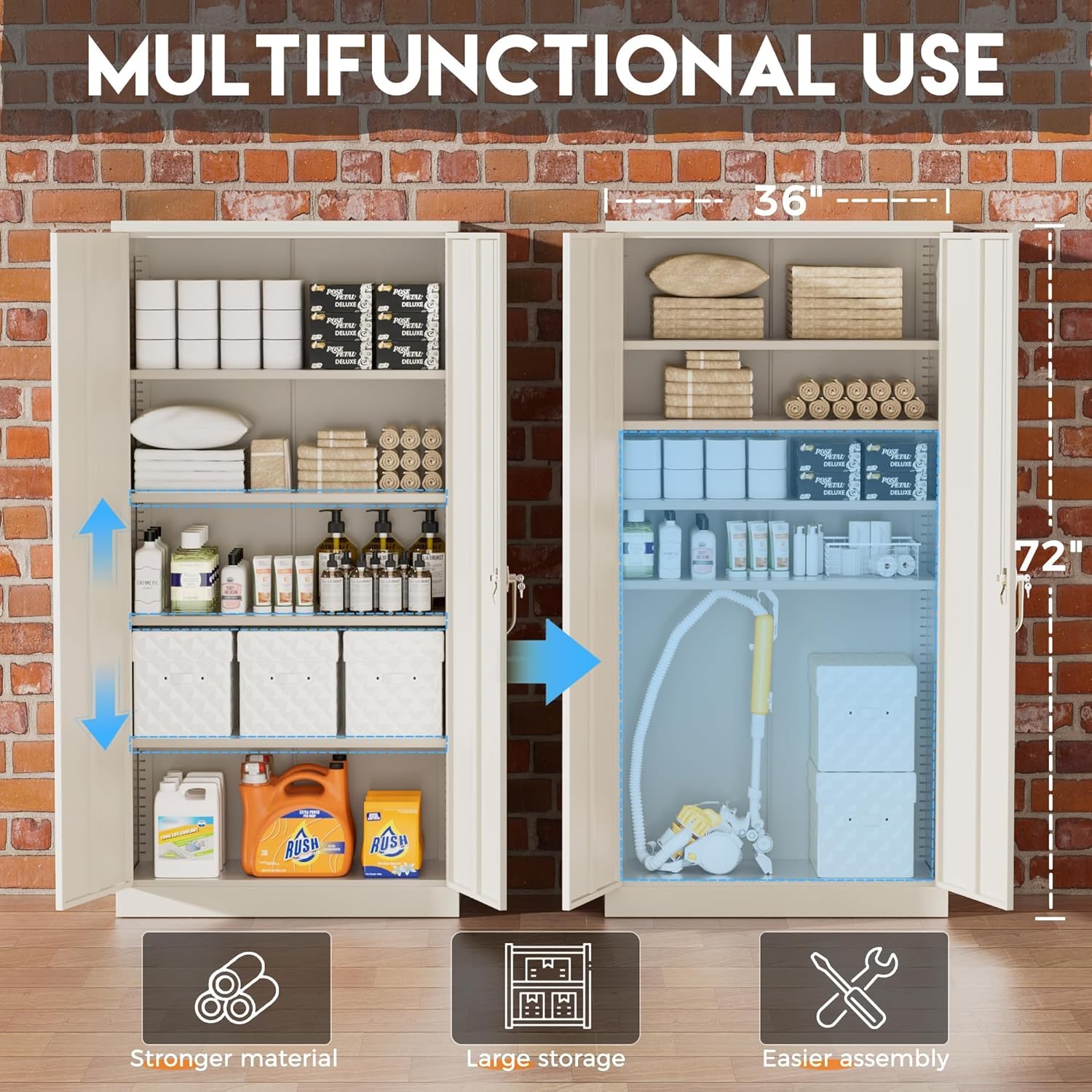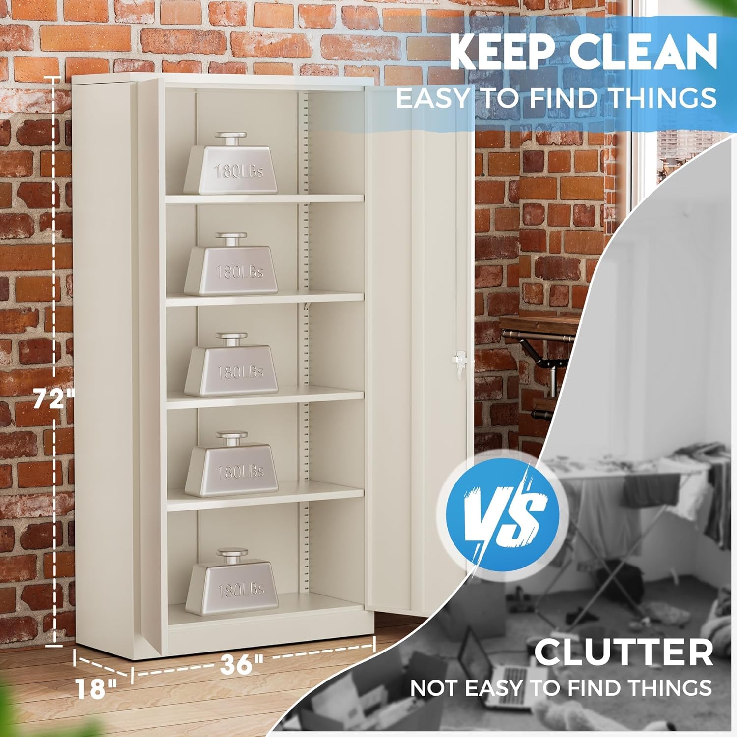 - 【Multipurpose Large Cabinet】Greenvelly 72"H x 36"W x 18"D lockable garage organization cabinet with 2 locking doors and 4 adjustable shelves, can move the shelves up or down according to your need, each layer can bear 180 pounds, suitable for storing office documents and tools, as well as heavy items. Durable black metal bedroom armoires cabinets are an ideal choice for home office, utility room, laundry, kitchen, garage, school, shop, warehouse, business etc