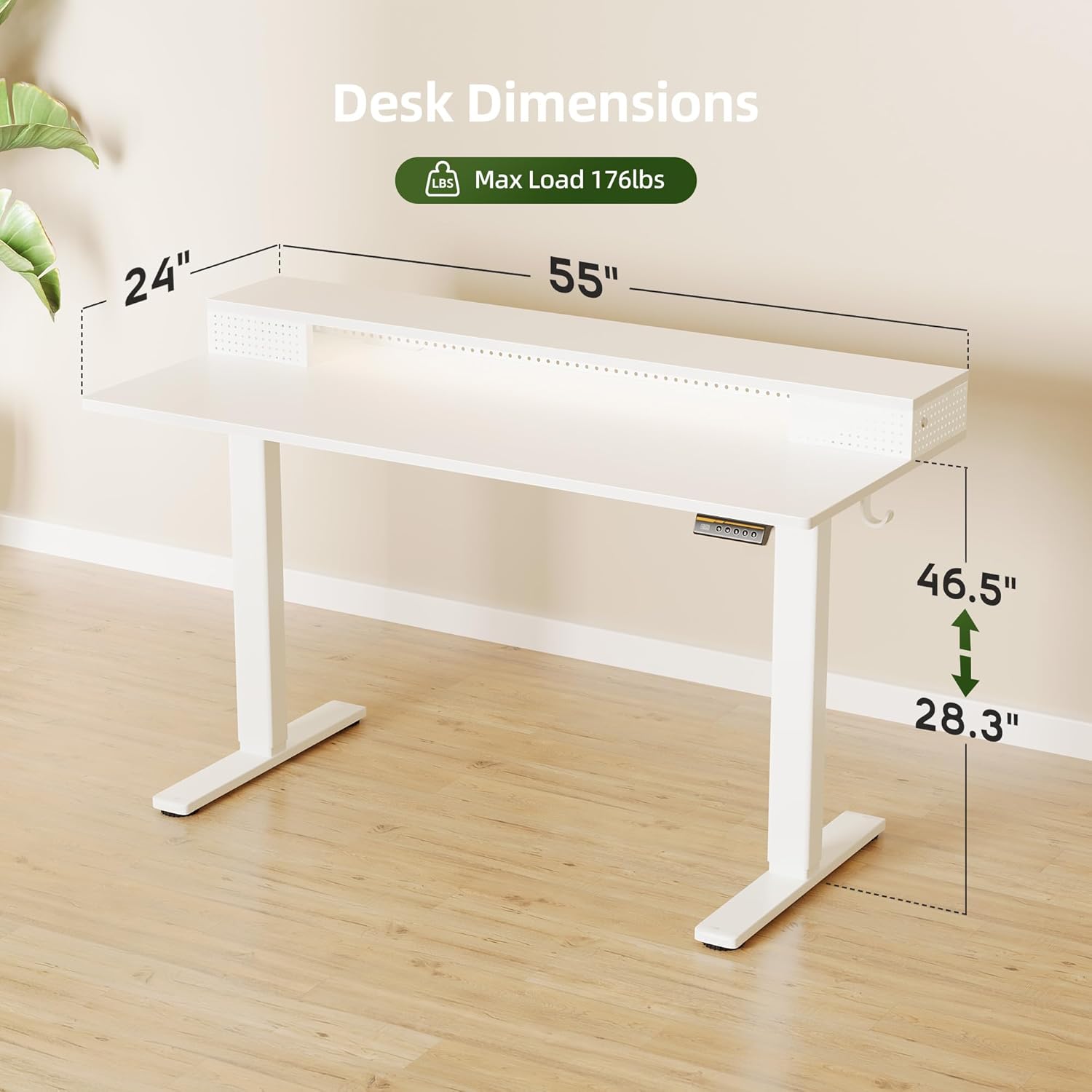 Claiks Electric Standing Desk with Shelf, 55 Inch Height Adjustable Standing Desk with LED Lights & Monitor Stand, White Frame/White Top