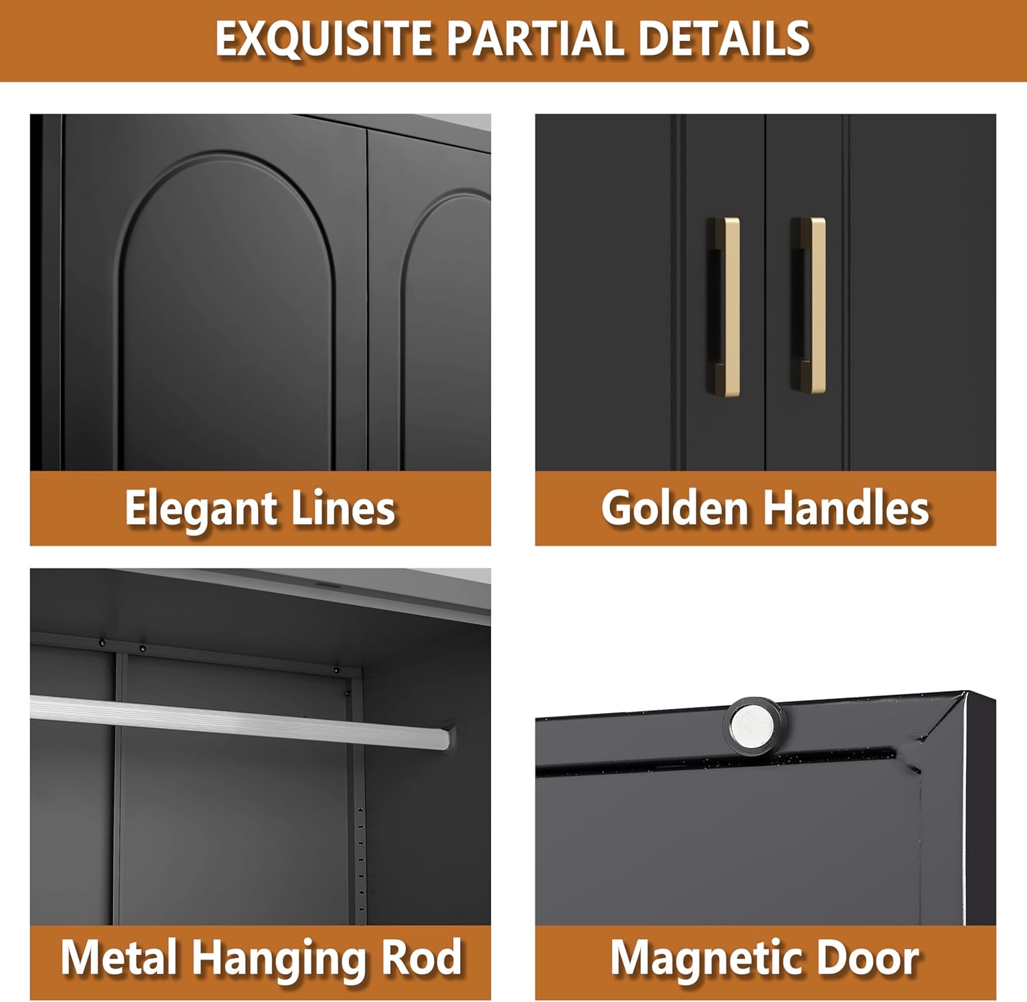 - [STURDY AND RELIABLE] Crafted from thickened steel panel, this black wardrobe stands firm and stable. Its robust clothing hanging pole can withstand up to 66LBS loding-bearing, ensuring years of reliable use. Reinforced joints and thick metal panels guarantee no wobbling or collapsing, even when fully loaded with lots of clothes