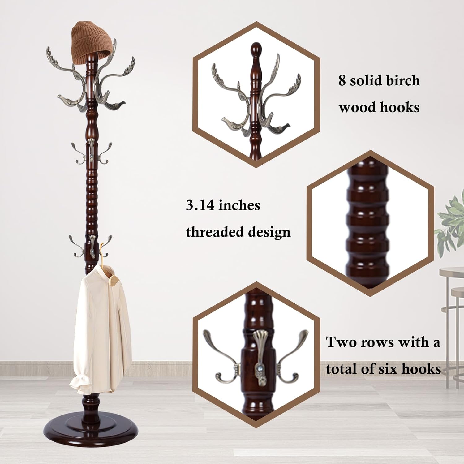 - 【Wider Application】The wooden coat tree is designed in a vintage style, with a simple structure and comprehensive functions. The coat rack can be placed in the hallway, living room, bedroom, office, and any corner you need. The wooden coat tree stand adopts an embedded screw design and is connected to the main pole, and the full-tooth screw is connected to the chassis. Equipped with installation tools and instructions, you can easily complete the installation.