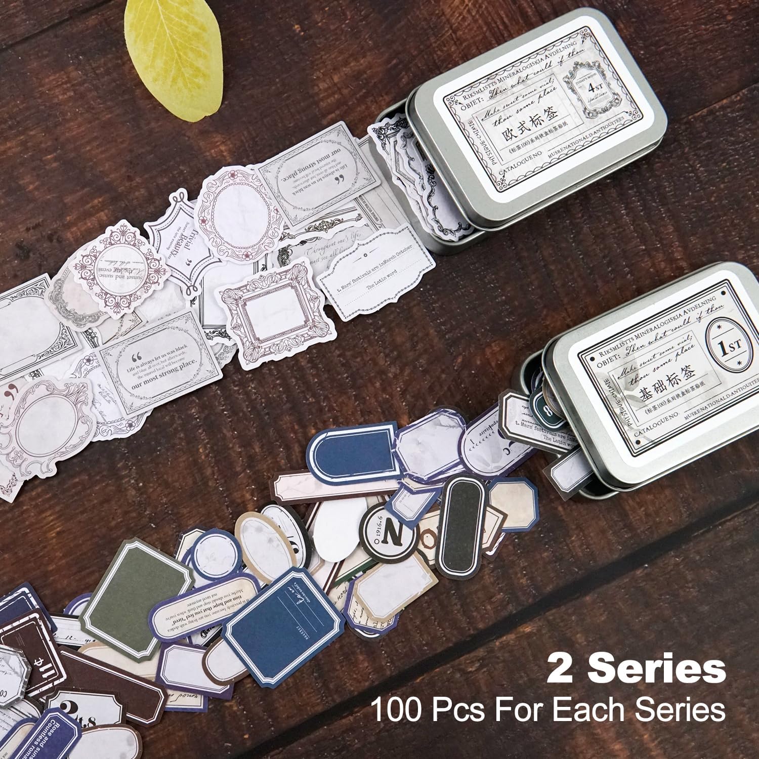 200 PCS Vintage Label Stickers Set, Retro Europe & Basic Designs for Journaling, Scrapbooking, DIY Crafts, Gift Wrapping, and Art, Includes 2 Iron Tins