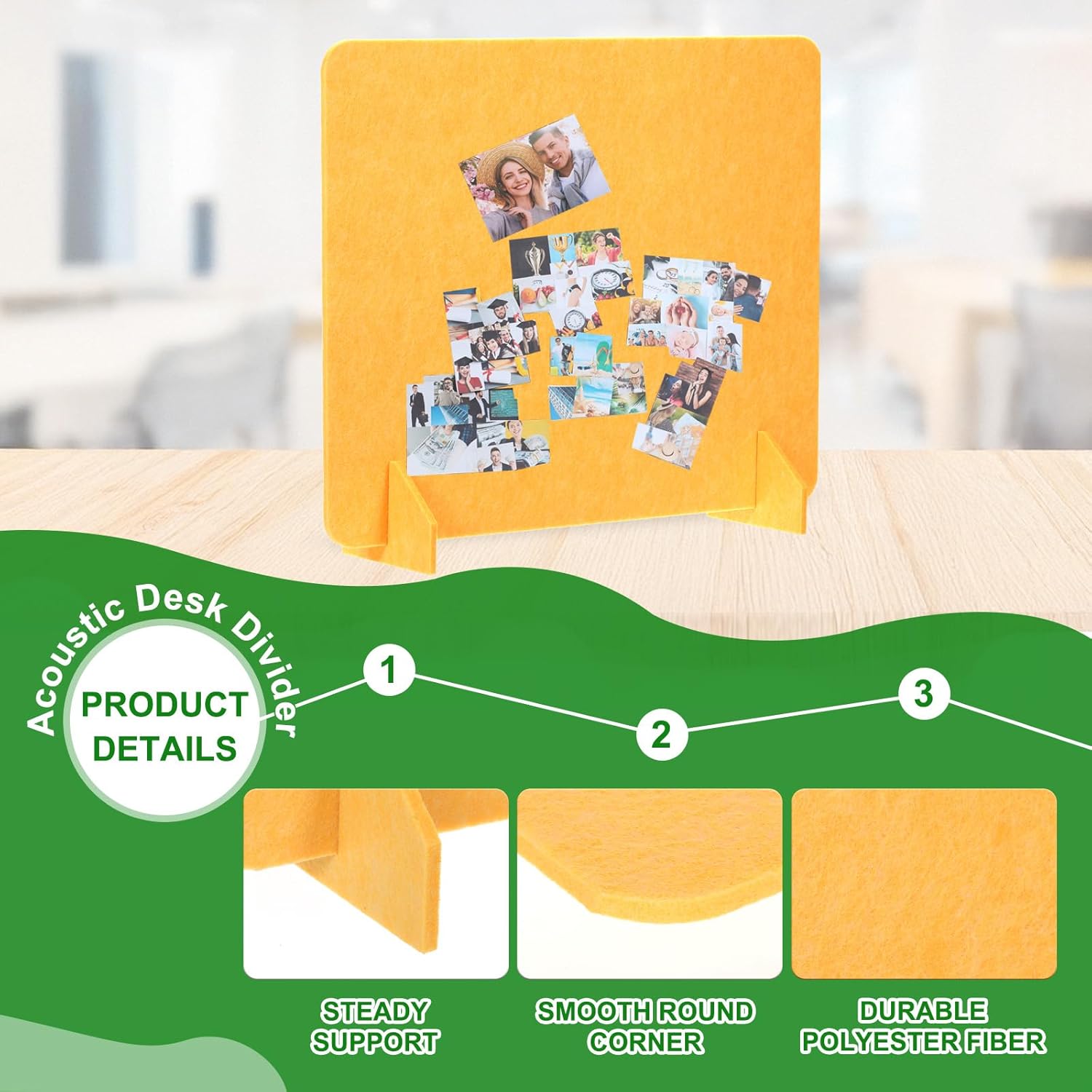 - Specification: Material: Polyester Fiber; Size: 600 x 600 mm/23.6 x 23.6 Inch(L*W); Thickness: 9mm/0.4 Inch; Color: Yellow; Packing List: 2 Sets x Desk Dividers(Each Set includes 1 Pcs x Divider and 2 Pcs x support feet)