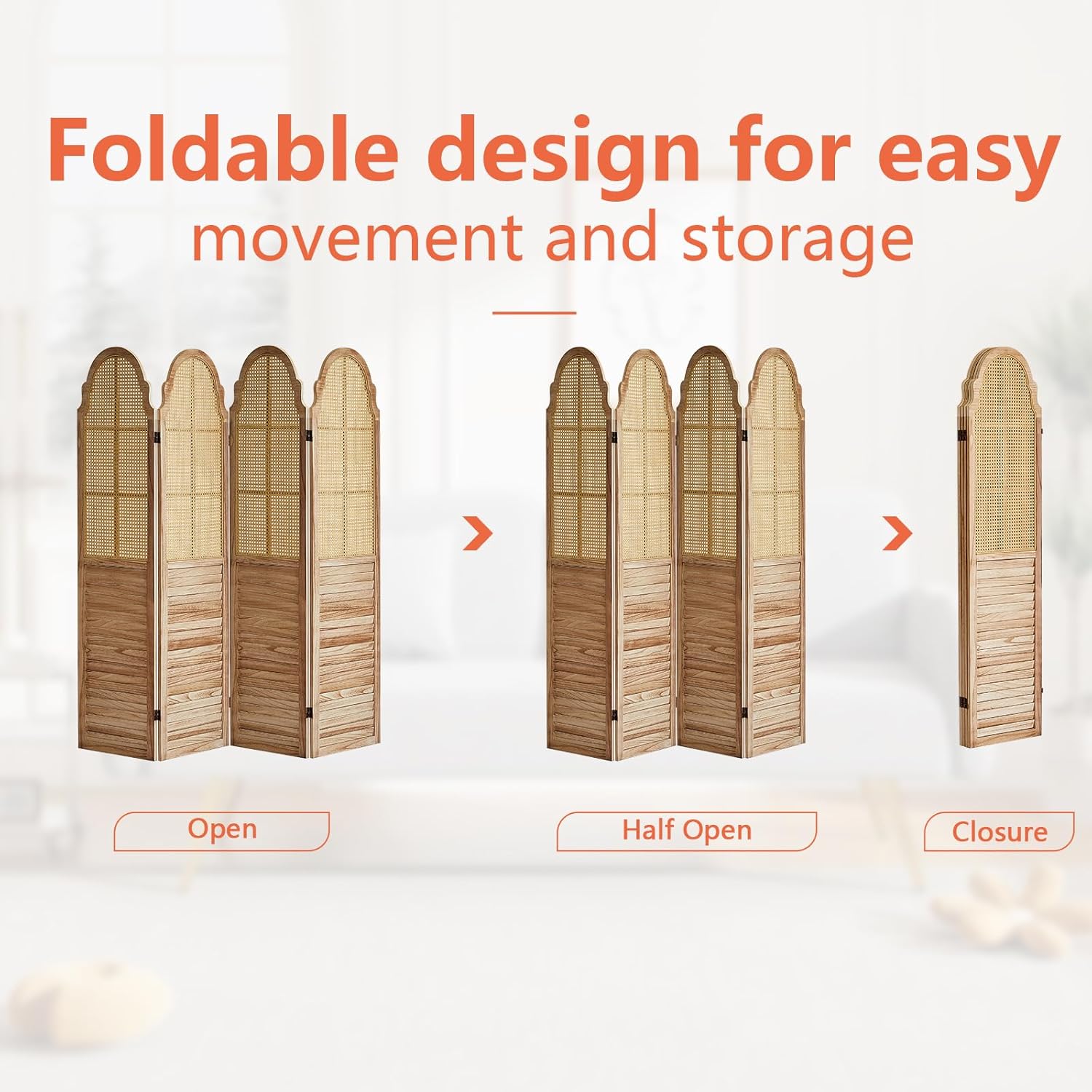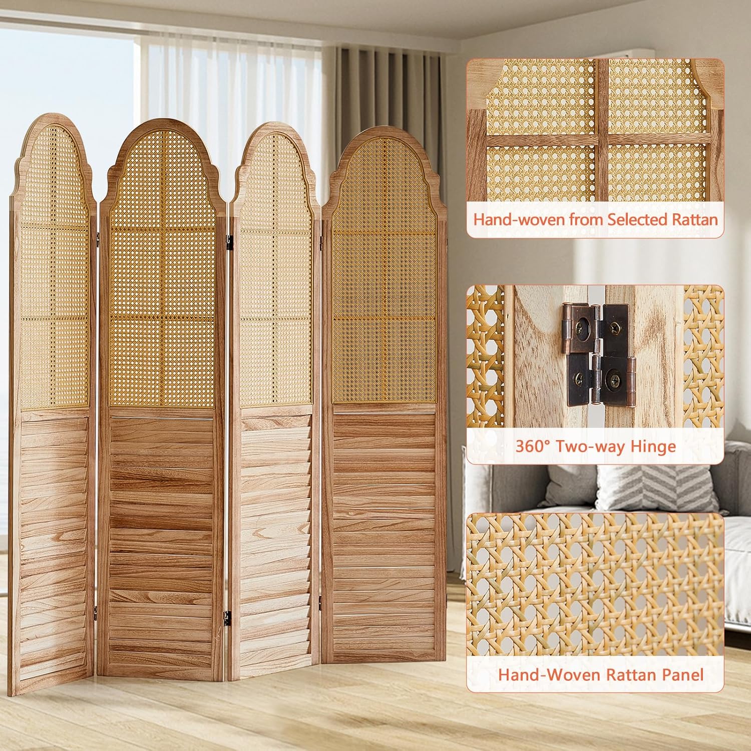 4 Panel Rattan Folding Screen Room Divider, Privacy Dividers for Rooms, Louvered Partition Dividers, Room Divider Panel for Bedroom, Dressing Room, Balcony, Light Brown