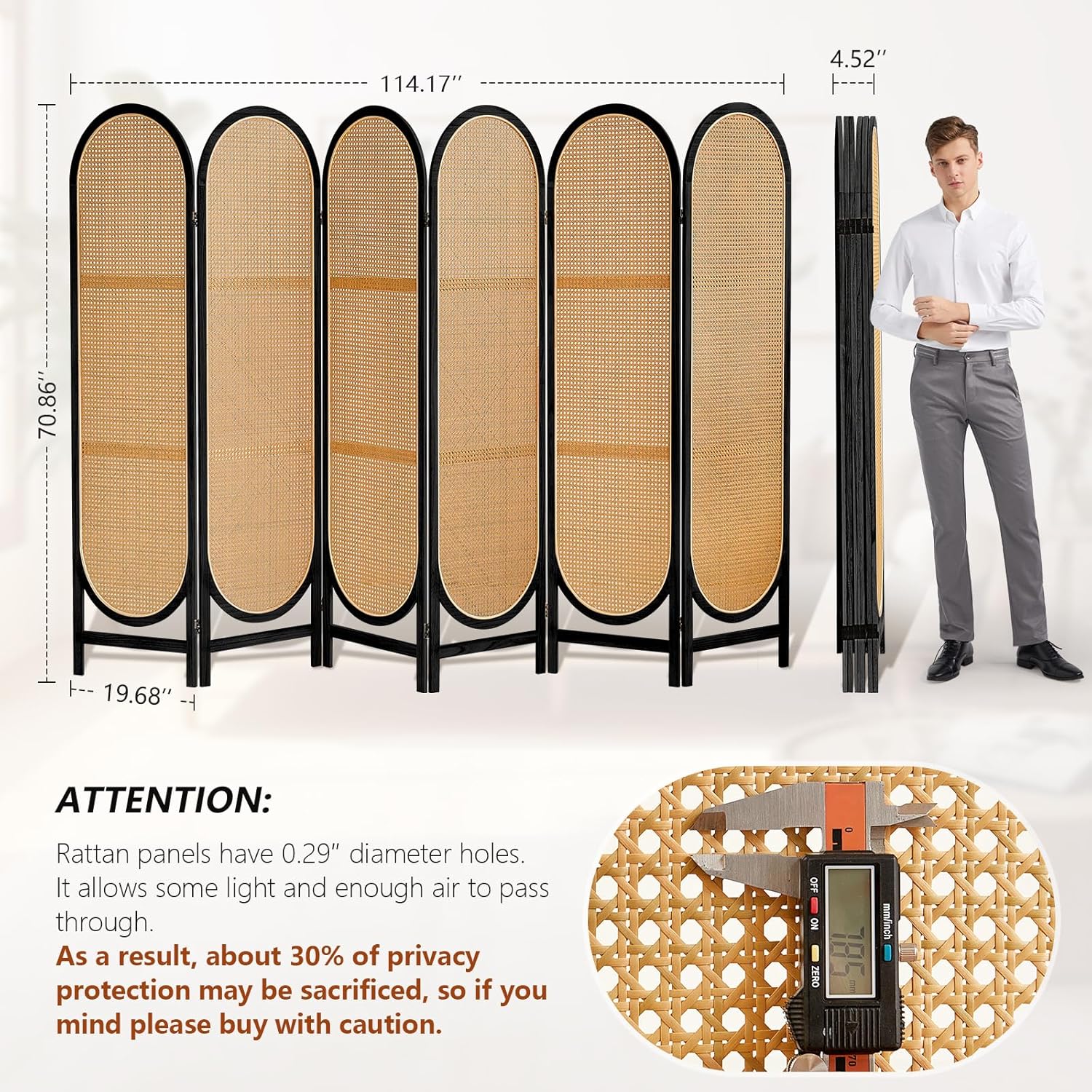 - Great for No Wall Art Solutions: This 5.9 ft tall folding wooden room divider screen can easily provide extra private space for living room, bedroom, etc. with an elegant design that protects some of your privacy while decorating your room. The room divider provides 70% privacy with 30% visibility through the woven rattan. So rattan room divider screens can keep your space bright and breathable. But because of this, you may lose some privacy. If you mind, please buy with caution