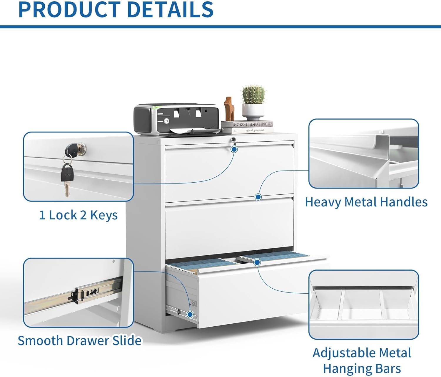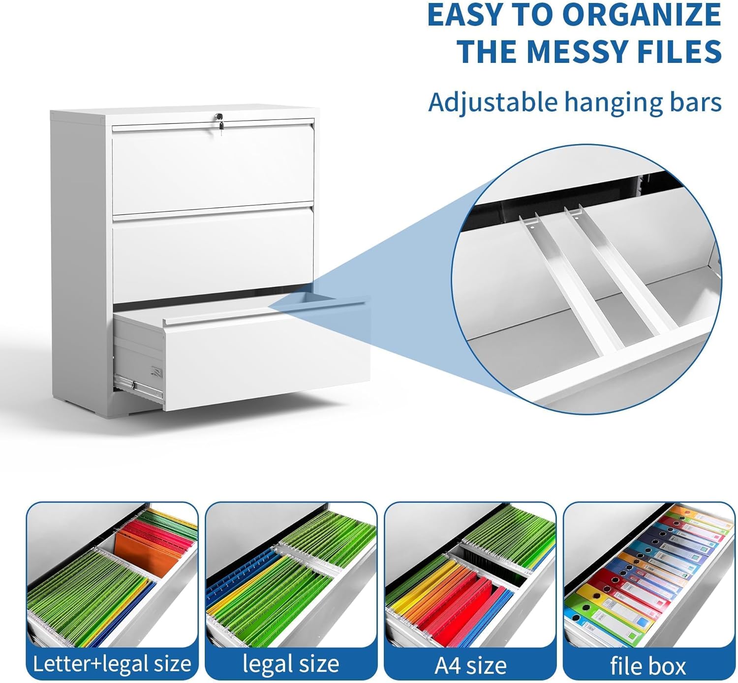 Lateral File Cabinet 3 Drawer, Metal File Cabinets for Home Office Legal/Letter A4 Size, File Cabinet with Lock, Require Assembly, White