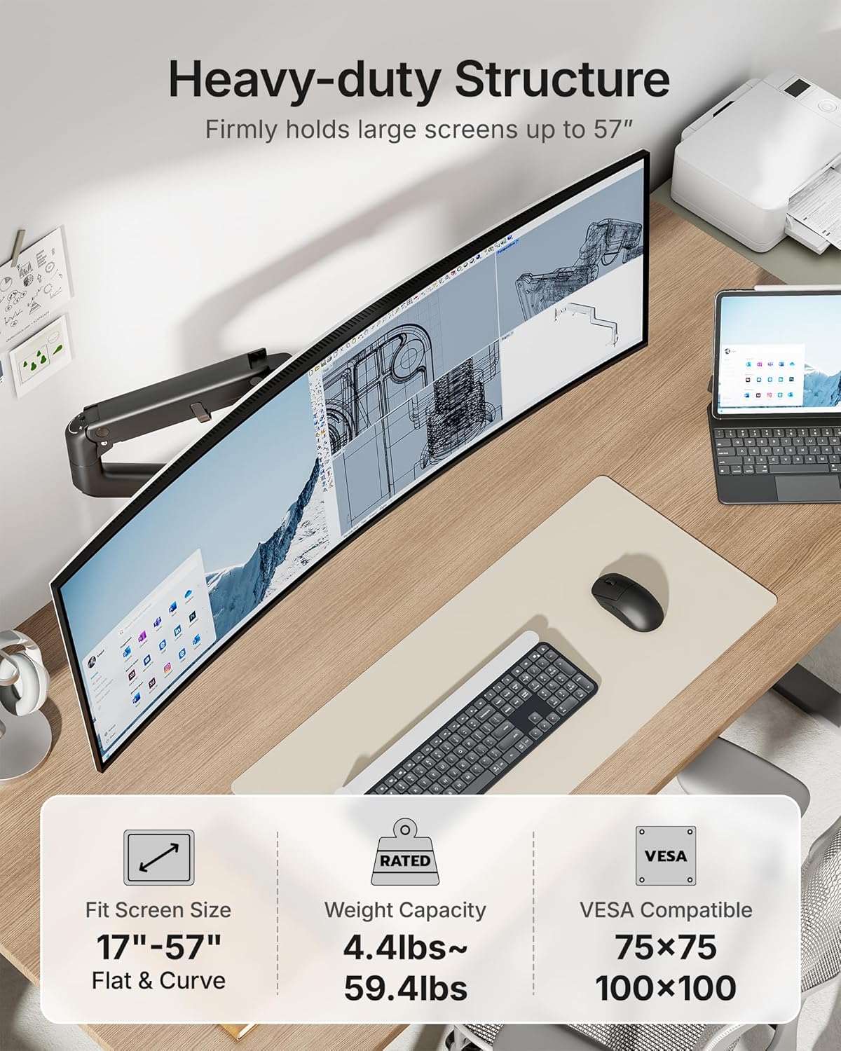 - 【Supports up to 57 Inch and 59.4 lbs】This heavy duty monitor arm securely holds ultrawide monitor weighing up to 59.4 lbs, and is compatible with most flat and curved screens for 17 to 57 inch. It comes with 75x75 or 100x100 VESA mount holes. Perfect for Samsung Odyssey G9, LG and most 57 inch curved monitor available on the market. Please ensure your monitor has compatible VESA mount holes—if not, you will need to prepare your own VESA mount adapter (not included)