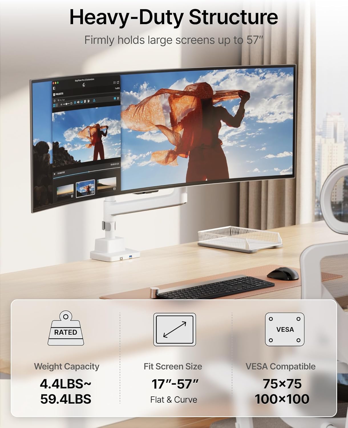- 【Functional & Space-Saving Design】Designed for both convenience and organization, this ultrawide monitor arm features built-in USB-A 3.0 and USB-C ports for easy device charging and fast data transfer, Whether for gaming, professional workstations, or compact offices, these arms deliver unmatched performance