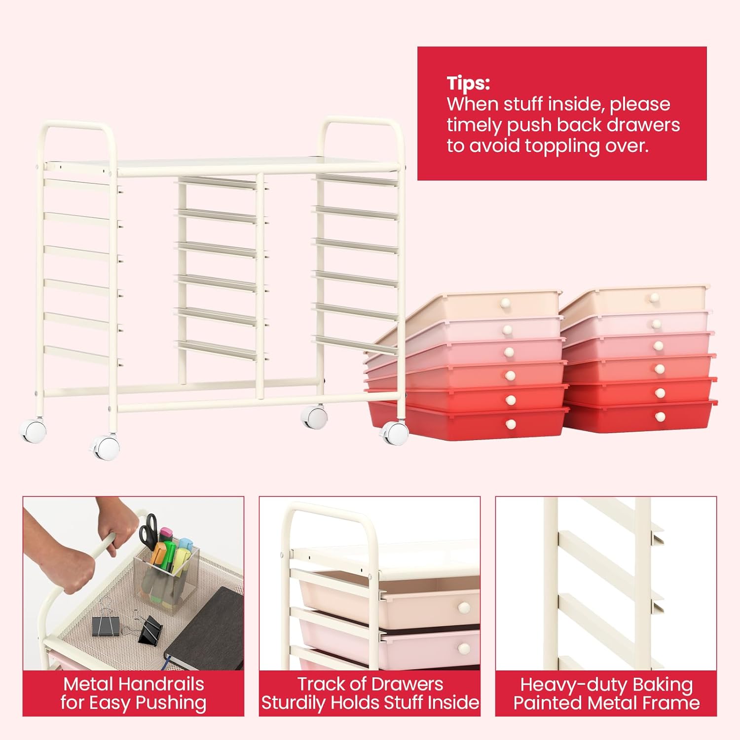 - [Sturdy & Durable Structure]: Crafted of heavy-duty baking painted metal frame, the 12-drawer storage cart provides enhanced support and long-term durability. More, durable PP drawers can withstand the test of time.
