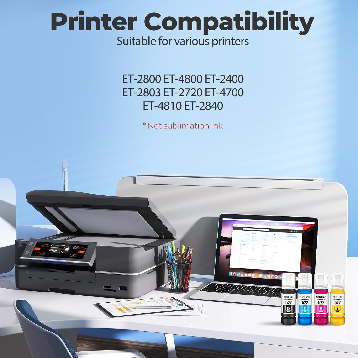 522 Ink Refill Bottles ET-2800 ET-2400 ET-4800 Replacement for 522 Ink 2800 Refill Ink for Eco tank ET-2400 ET-2720 ET-2800 ET-2803 ET-4700 ET-4800 ET-4810 ET2400 ET2720 ET2800 ET2803 ET4800 Printers