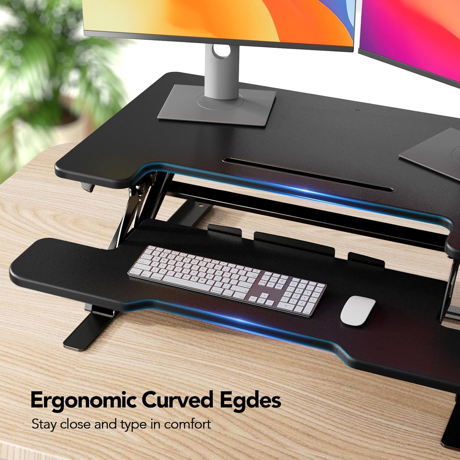 HUANUO 36" Z Shaped Stable Electric Standing Desk Converter, Height Adjustable Sit Stand Up Desk Riser, Dual Monitor and Laptop Workstation with Wide Keyboard Tray, Desk Lifter for Home Office