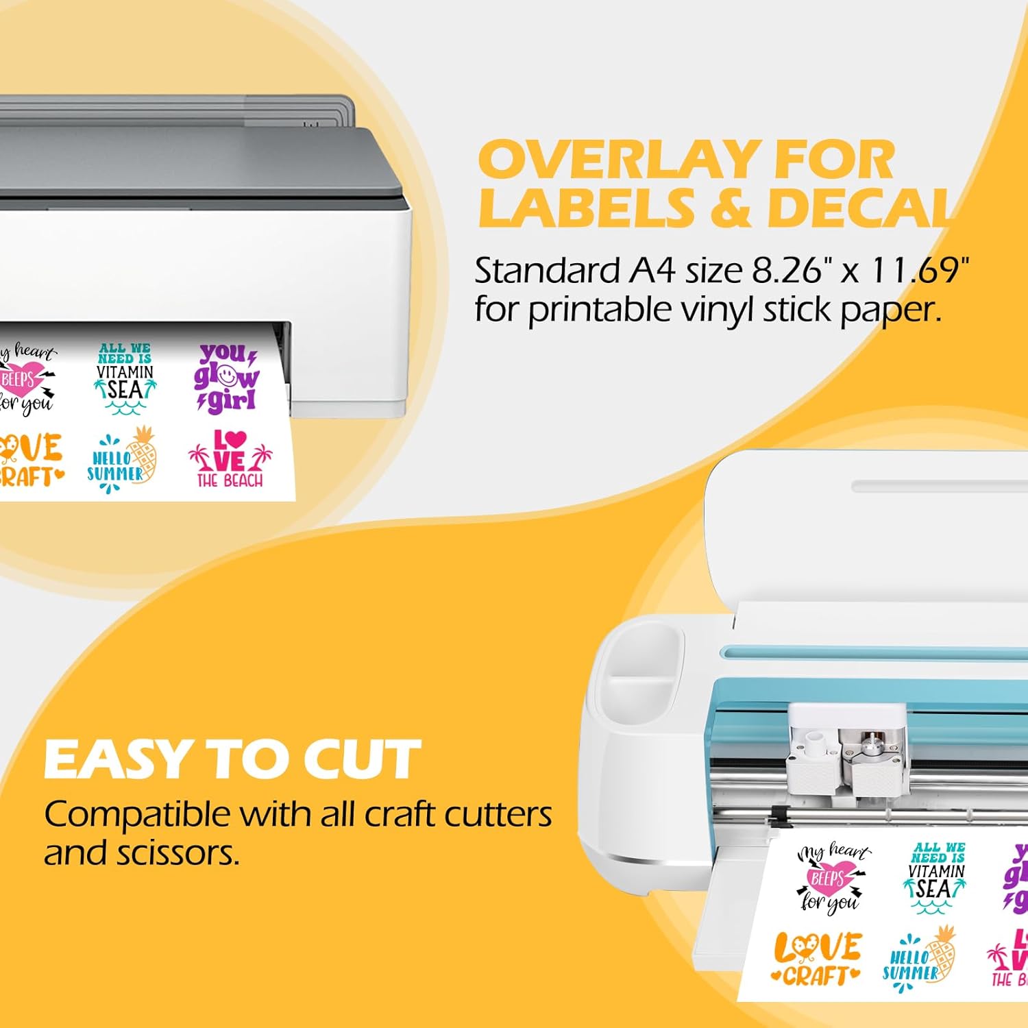 - Easy to Use with Printers & Cutting Tools - 8.26" x 11.69" A4 paper A4 sticker printer paper is compatible with all craft cutters. clear vinyl glossy laminate sheets for stickers glossy sticker paper is also easy to cut with scissors. Use alongside printable sticker paper, vinyl sticker paper for inkjet printer, or printer sticker paper to make professional-grade stickers self adhesive laminating sheets —just peel and stick.