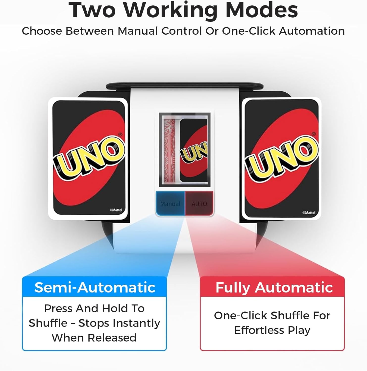 - [Universal Card Compatibility] Featuring an innovative retractable guide-wing design, this shuffler adapts to cards of varying sizes (1-2 standard decks) and supports popular games like Texas Hold'em, Bridge, UNO, Five crowns card, Phase 10, Skip-Bo and Blackjack. The patented structure ensures smooth card insertion for zero-jam shuffling