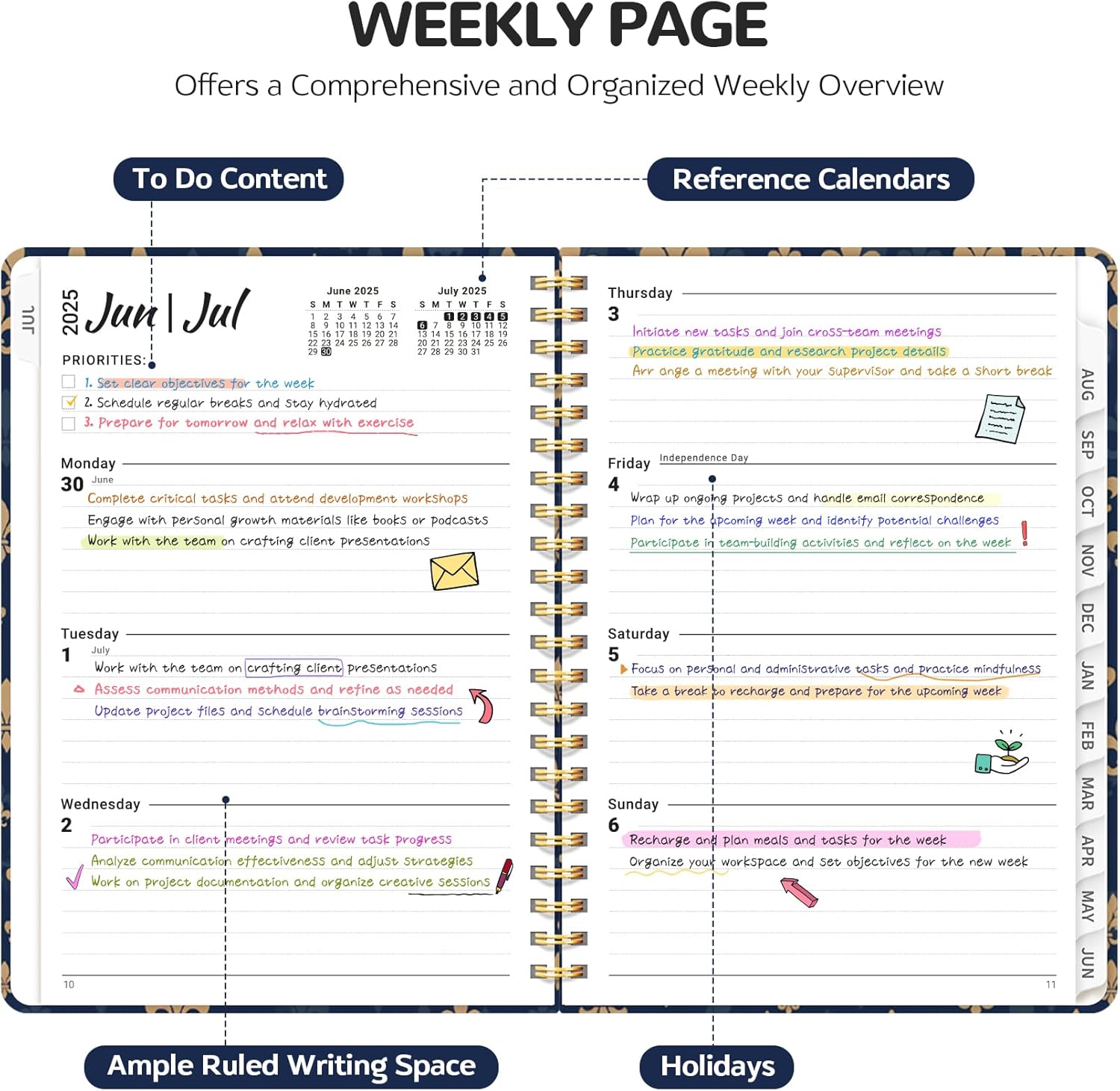 - Comprehensive Planning:The planner covers the school year from July 2025 to June 2026, offering 12 months of planning. Monthly and weekly calendar pages provide ample room to manage your schedule, set goals, and track progress.