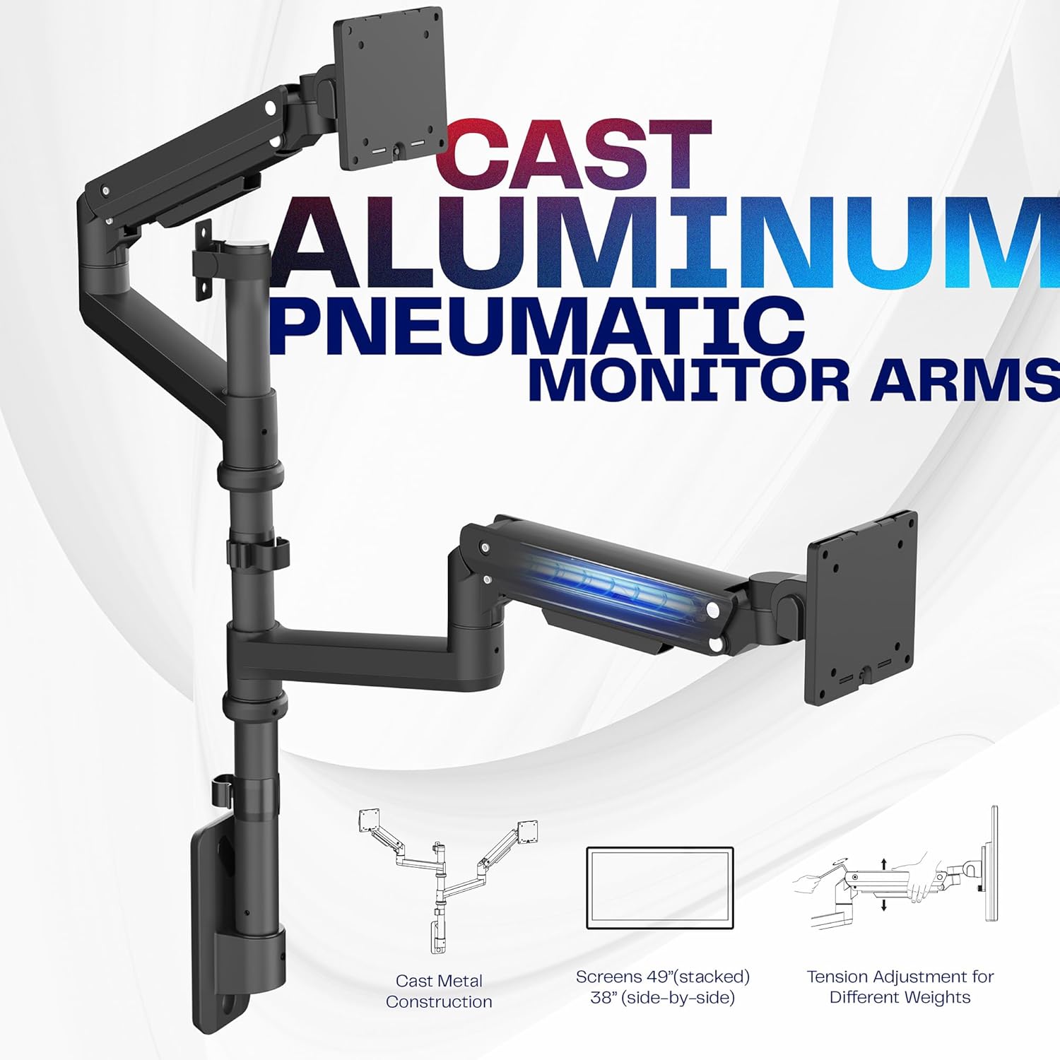 - Heavy-Duty Cast Aluminum Construction: Arms are made of premium cast aluminum for maximum strength, scratch resistance, and durability. High-capacity tilt joints accommodate heavier screens without sagging. Holds 4.4 lbs to 33.5 lbs per arm