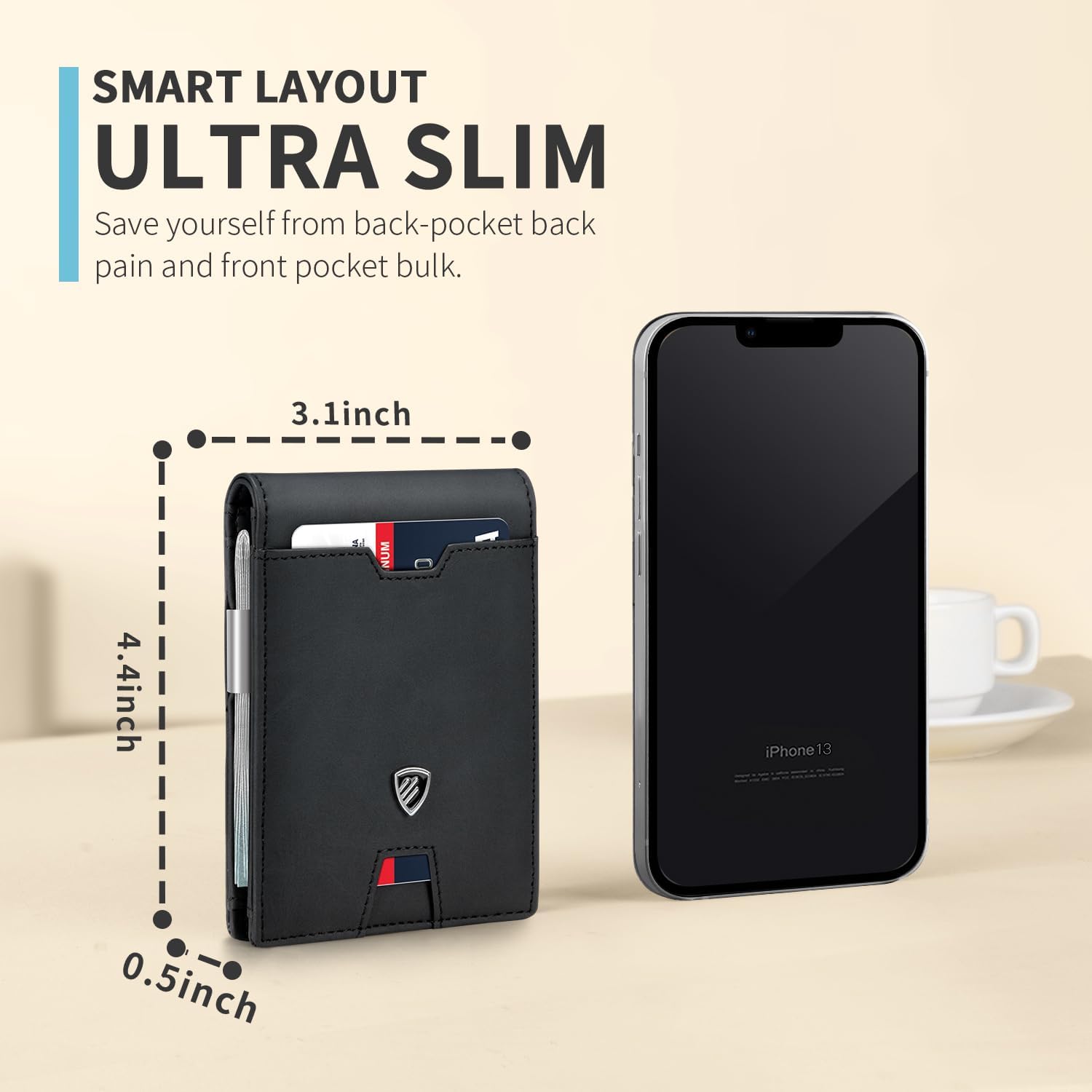 - Slim Wallet for Men - The Minimalist wallet being 1/2 inches thicks, sized 4.4" x 3.1" with money clip has 11 card slots which can store up to 15 cards. The thin wallet for men perfectly fits in your pocket and well-suited for everyday carry