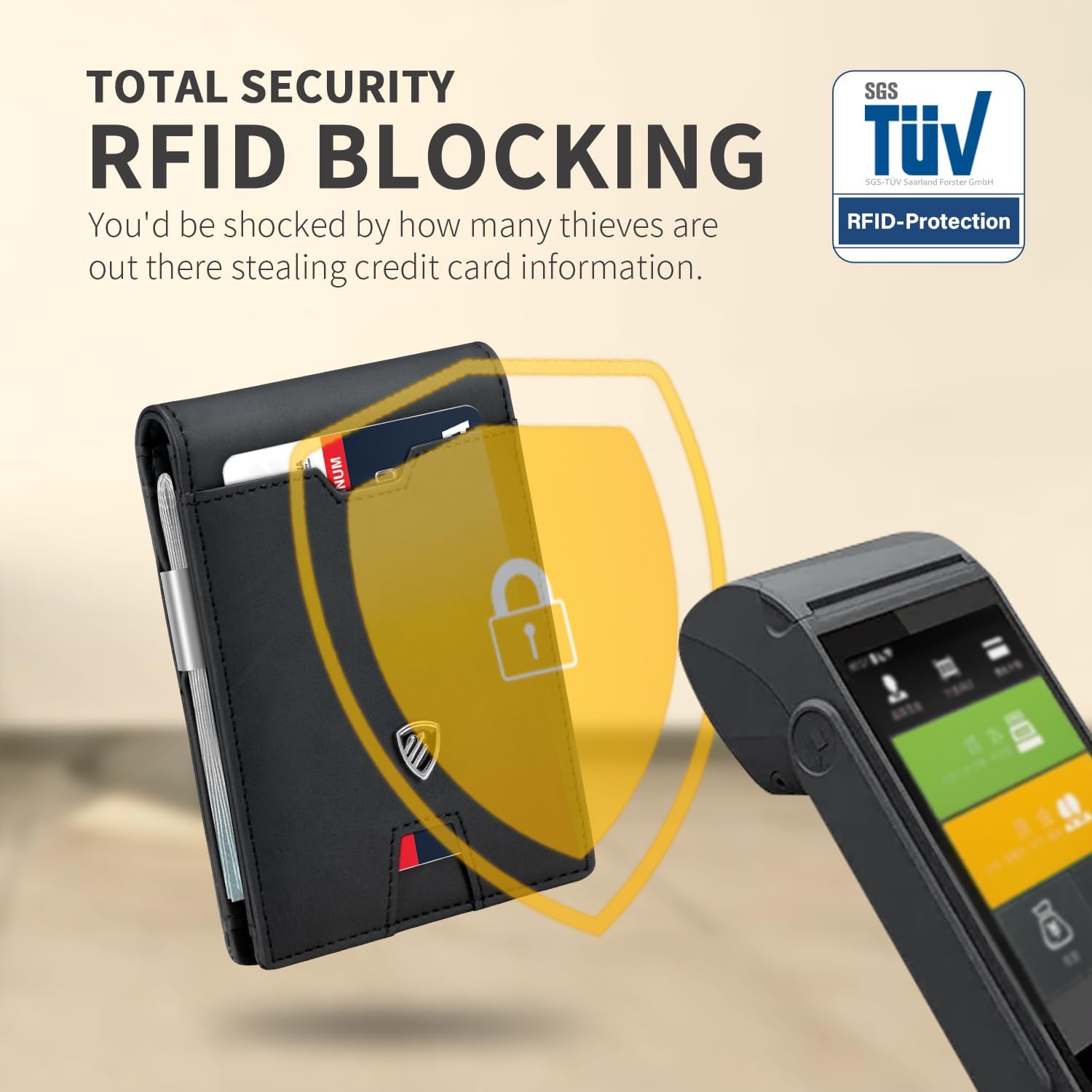 - RFID Blocking Protection - This rfid wallet for men is tested by an independent German quality control institute, specifically to block 13.56 MHz or higher RFID signals and protect against data theft by RFID scanners