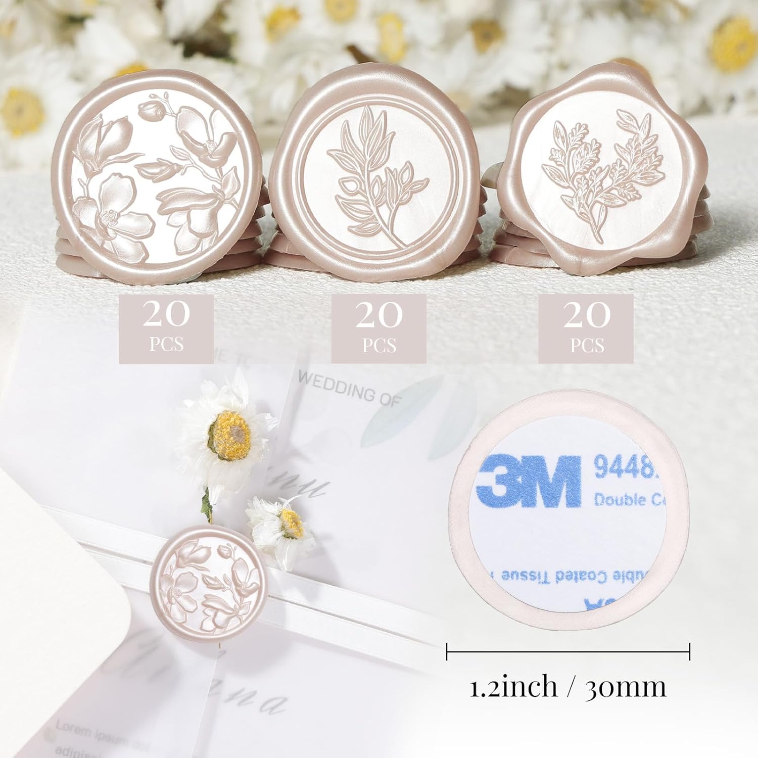 - PACKAGE INCLUDES - You will receive 60 pieces of champagne color wax seal stickers, (20 stickers per design) - Magnolia & Eucalyptus & Olive Branch. The wax seal sticker diameter is 1.2 inches/30mm and with almost the same size of adhesive on the back. Weighs 0.02oz per seal and may add weight to envelopes.