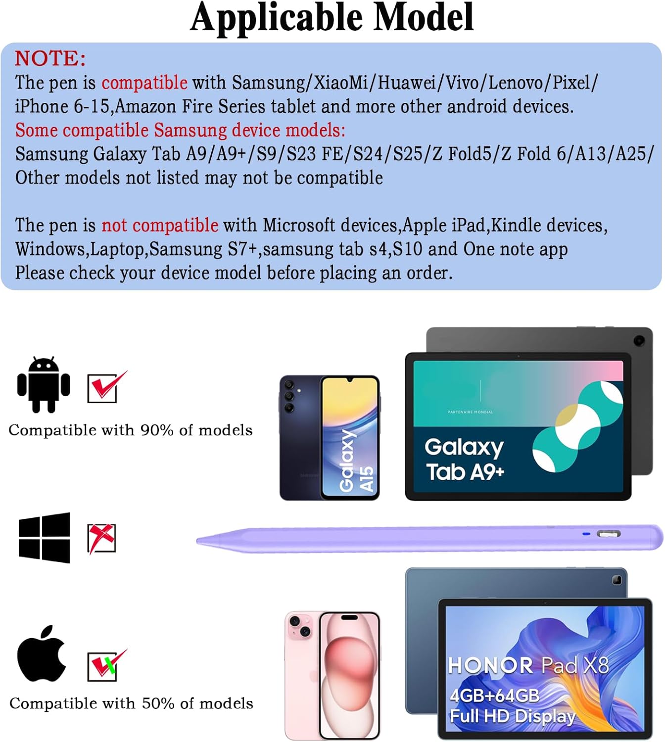 - 【Wide Compatibility】-This stylus pen for touchscreen is universal for capacitive screen electronic products and is specially designed for Android device on the market.The iphone stylus pen is suit with Samsung/XiaoMi/Huawei/Vivo/Lenovo/Pixel/iPhone 6-15 ,Amazon Fire Series tablet and more other android devices. Some compatible Samsung device models-Samsung Galaxy Tab A9/A9+/S9/S23 FE/S24/S25/Z Fold5/Z Fold 6/A13 /A25/ (Note: This lenovo pen is not compatible with Microsoft devices,Apple iPad,Kindle devices,Windows,Laptop,Samsung S7+,samsung tab s4,S10 and One note app. Please check your device model before placing an order.