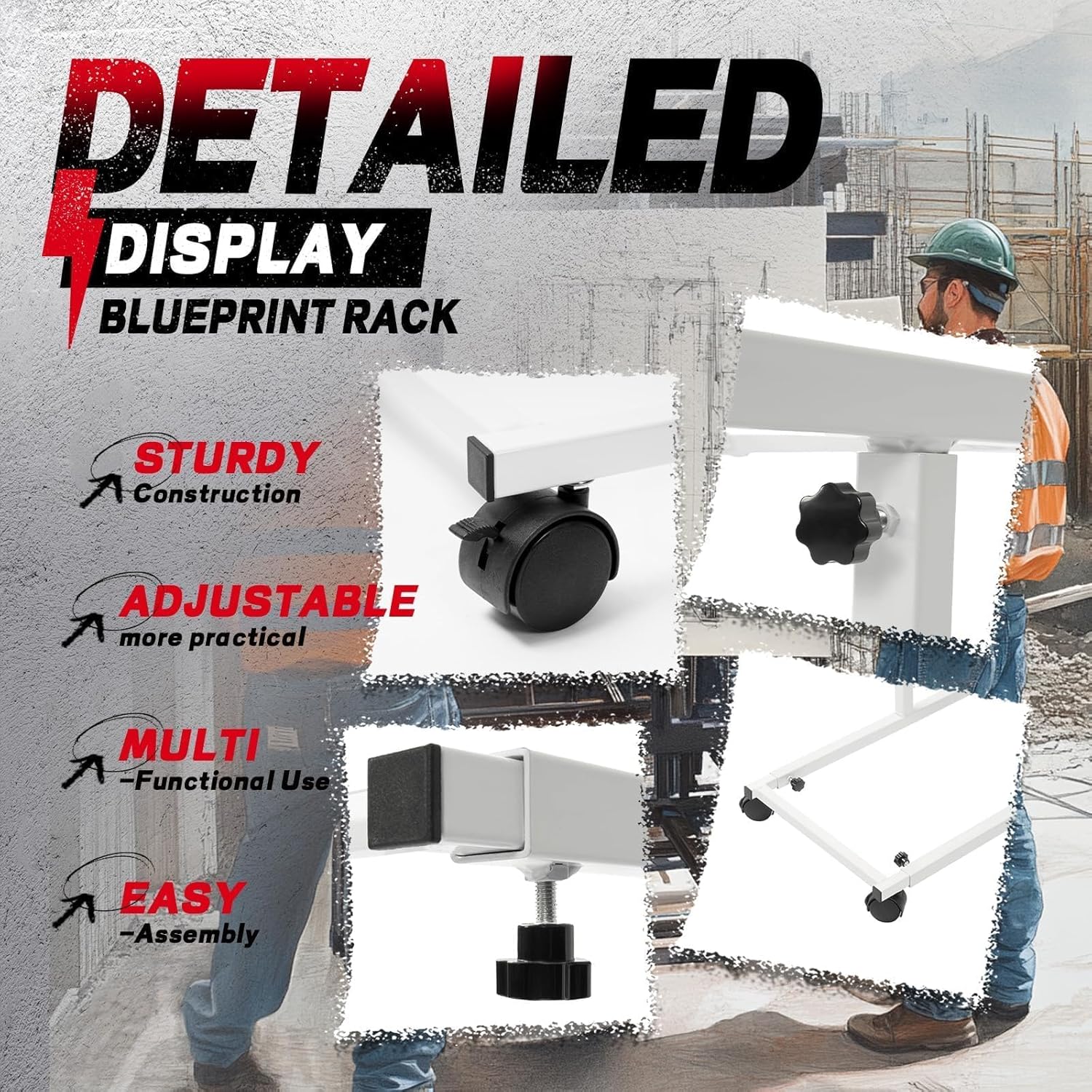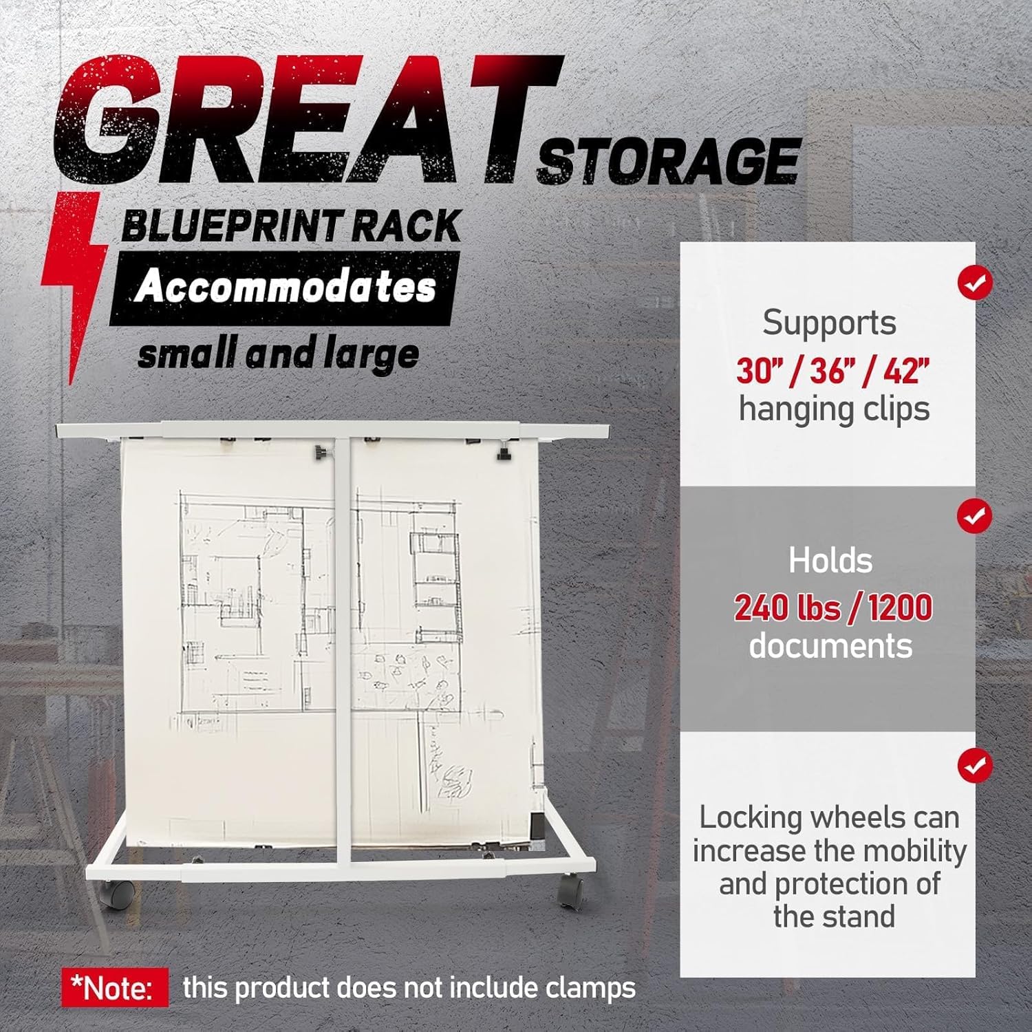 - Adjustable Designs: The blueprint holder is designed to accommodate people of all heights with its adjustable height and length. It supports 30", 36", 42" hanging clamps and holds a variety of file sizes. The base is equipped with 4 swivel casters to make transporting blueprints easier